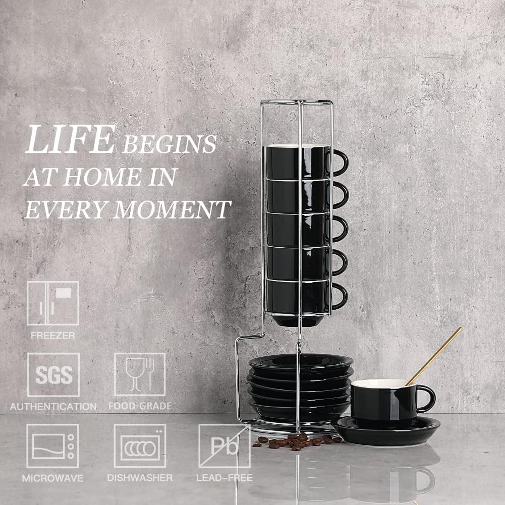 Sweejar Porcelain Espresso Cup & Saucer Set, Stackable Demitasse Cups with Metal Stand, 2.5 OZ for Latte,Coffee,Cafe Mocha,Tea, Set of 6 (Black)