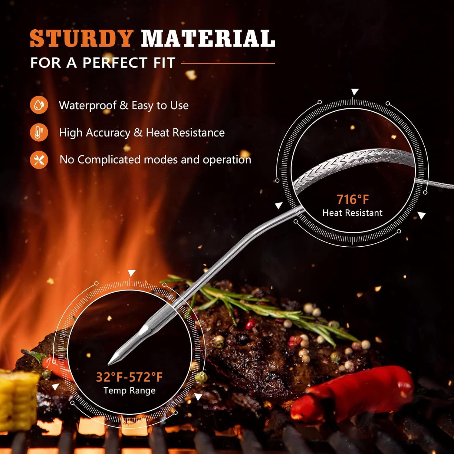 - STEP-DOWN TIP DESIGN: More accurate test temperature, 2.5 mm plug for use with all meats, The temperature probe will help you monitor the temperature of your food. Temperature detection range: 32 °F to 572 °F (0 °C to 300 °C)