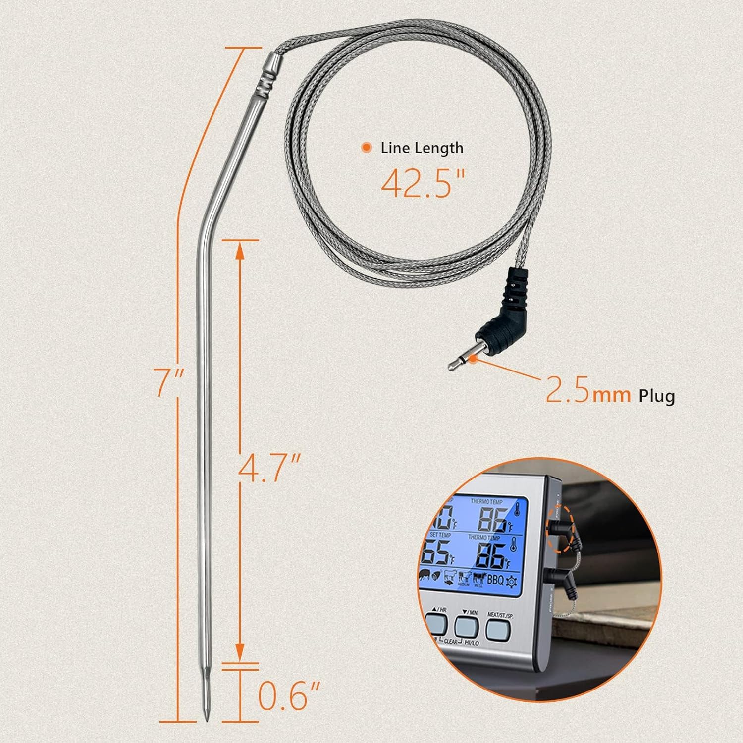 - PACKAGE INCLUDED: Temp Probe * 2, Clip Holder * 2. Probe with 42.5 inch length of stencil cable is more practical and can be inserted into the thermometer to begin reading temperatures immediately, while the steel clip can can help with better insertion into food