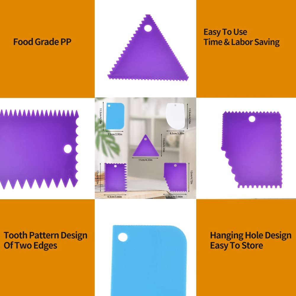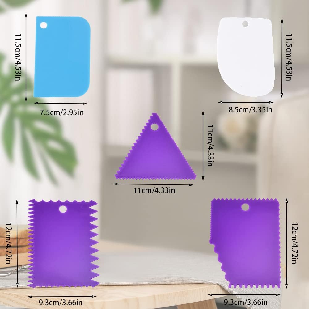 - 【Package include】:One set of 5 cake decorating smoother dough scraper. Color: Multicolor(1pcs-white+1pcs-blue+3pcs-purple)