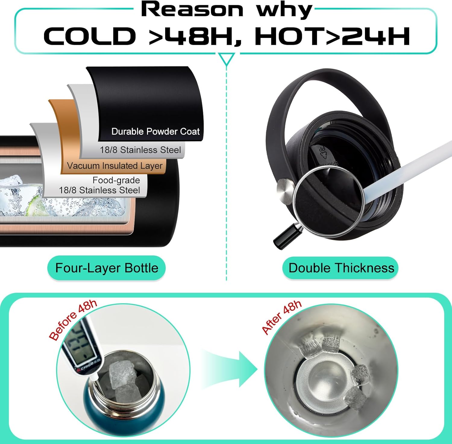 - TRIPLE-INSULATION & HIGH-PERFORMANCE: This wide mouth 1/2 gallon water bottle features triple-wall vacuum insulation and pro-grade stainless steel, it keep-cold for 48 hrs and keep-warm for 24 hrs without altering the taste and keeps your water tasting fresh. Using this metal water bottle on hot summer days or your next camping trip to stay hydrated all the day