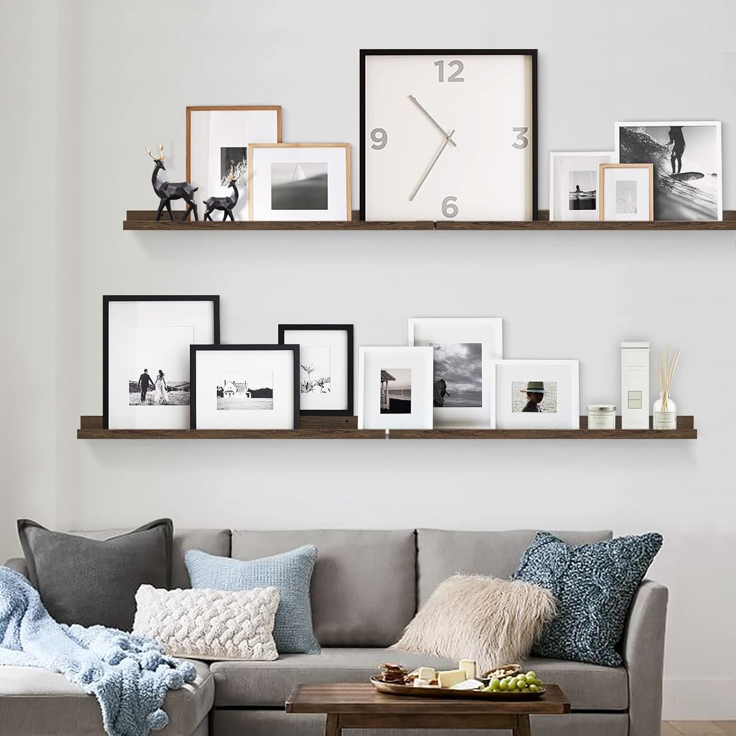- ăMultiple combinations, More creativityă You can connect two or more ledge shelves together to hang them in a line all as a EXTRA LONG SHELF to hold picture frames, art decor, collectibles in your room wall. They can also be hanged as vertical model as shelving unit rack and hold photo frames, family pictures, indoor plants, canvas, Knick knacks, pop figurines, mugs collectibles and vinyl records form your gallery wall in your living room, bedroom, family room or hallway.