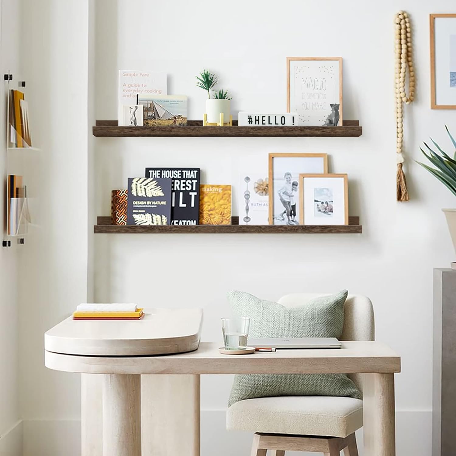 - ăSuitable for All OccasionsăThe sleek, simple design of wall photo ledge shelves allow them to match with nearly any aesthetic. The wooden picture shelf can help to declutter or free up counter space in your kitchen and office to make places much tidier and neater - from keeping seasoning, spices bottles and wine glasses in a kitchen area to organizing hand towels, toiletries, essential oil in a bathroom.
