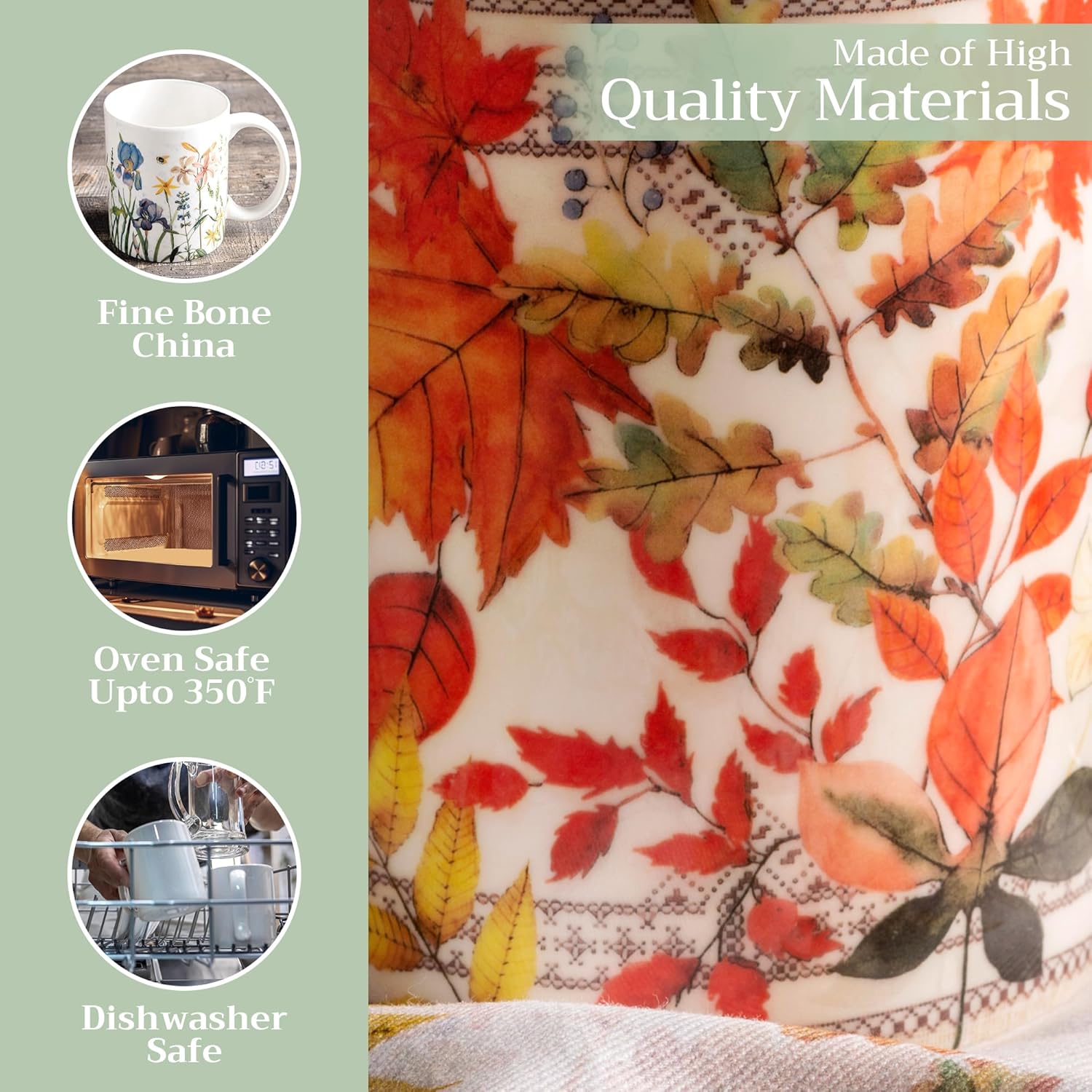 - Easy Care & Maintenance: Microwave, dishwasher, and oven safe up to 350°F. These bone china mugs are built for convenience and durability, making cleanup and reheating simple without compromising on quality