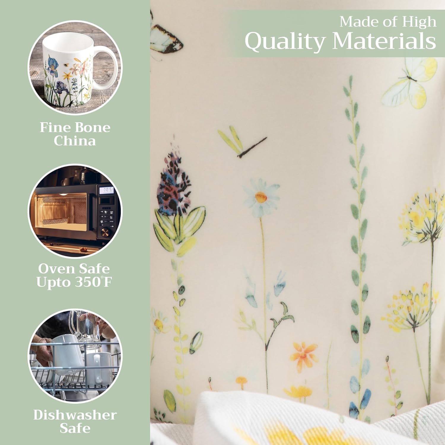 - Easy Care & Maintenance: Microwave, dishwasher, and oven safe up to 350°F. These bone china mugs are built for convenience and durability, making cleanup and reheating simple without compromising on quality