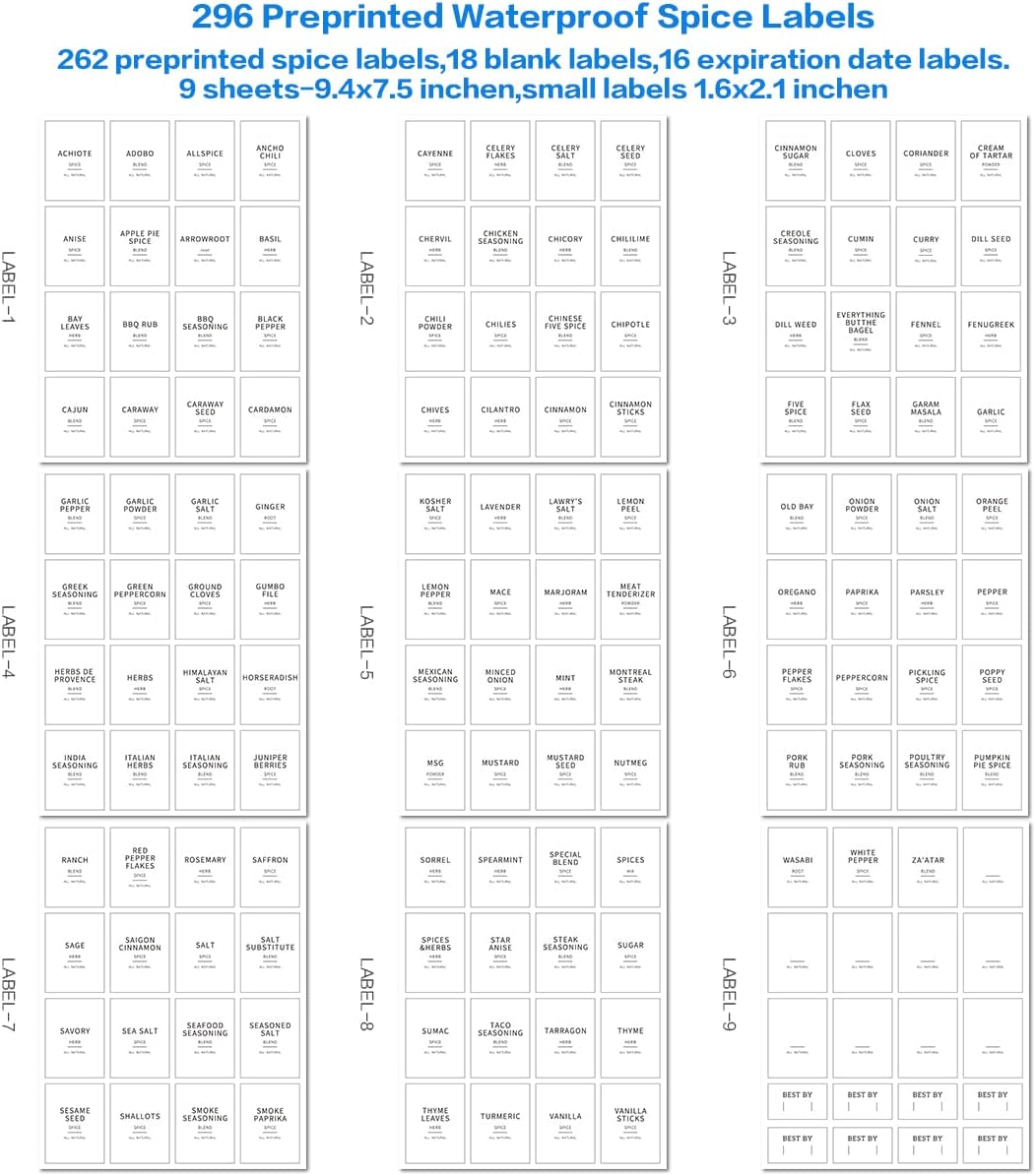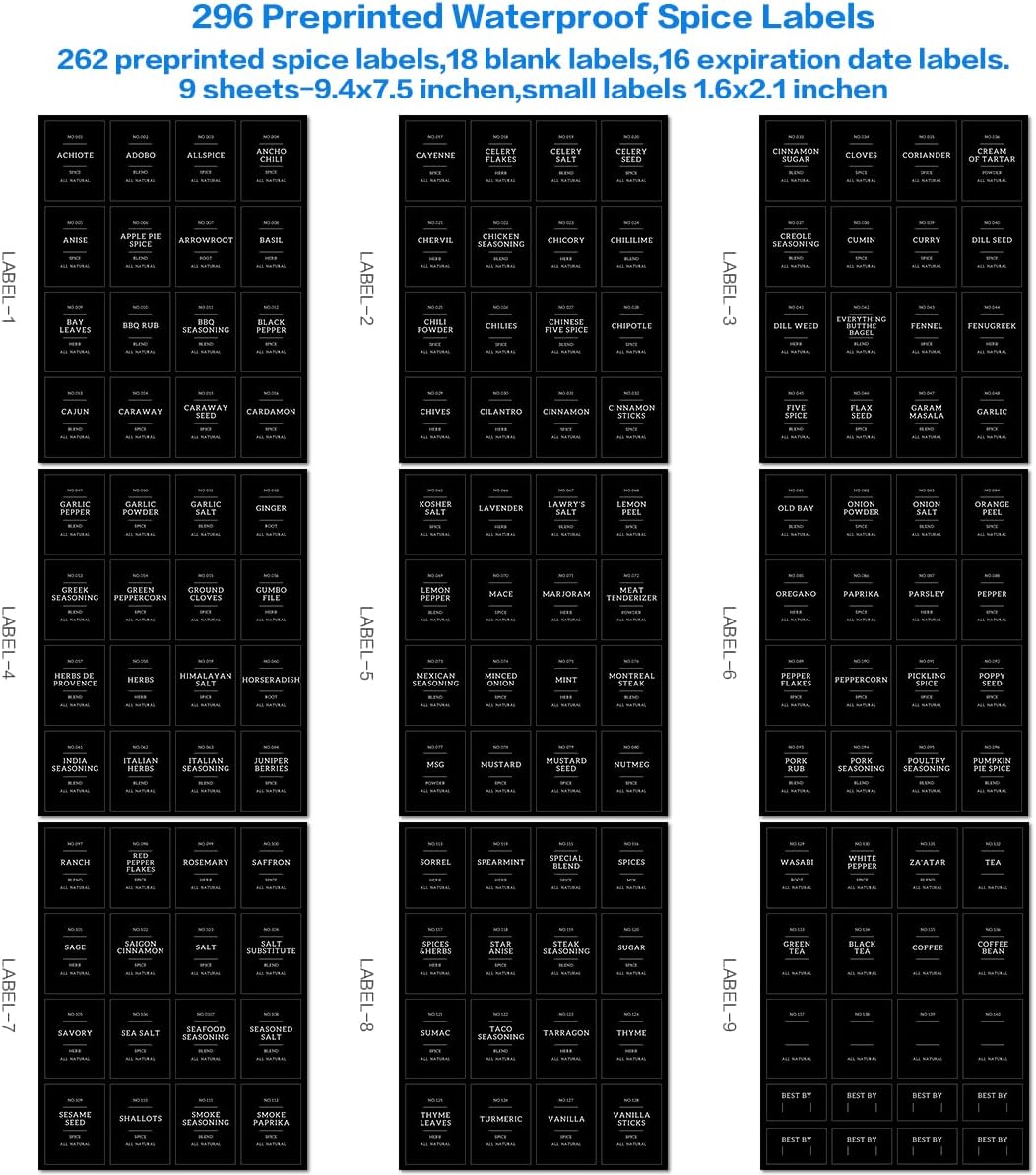 - 【BLACK AND WHITE WATERPROOF SPICE JAR LABELS】Our bamboo lid spice jars 10 oz labels of black and white color. Include 262 preprinted spice labels, 18 blank labels, 16 expiration date labels.
