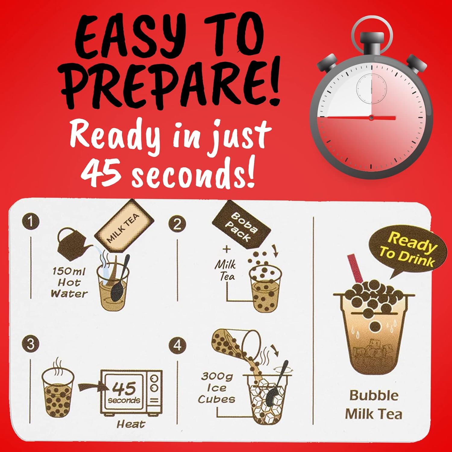 - ✅ EASY TO PREPARE - All you have to do is pour 1 pack in a cup with 150ml hot water until it dissolves. Add 1 boba packet and put it in the microwave for up to 45 seconds until your milk tea's ready.