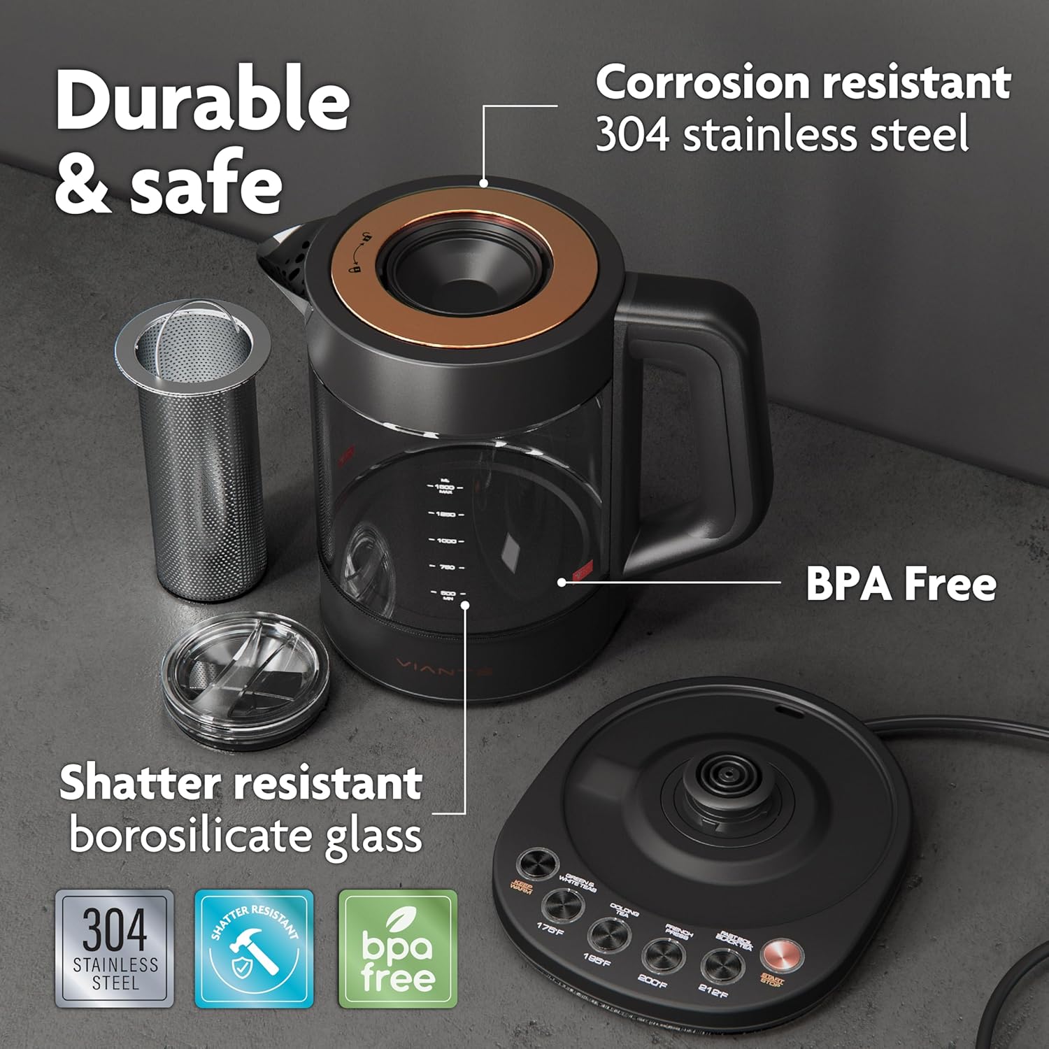 Vianté Electric Kettle With Infuser For Loose Leaf. Hot Tea Maker With Temperature Control And Automatic Shut Off. Tea Kettle With Brewing Programs. 1.5 Liters Capacity | Black Color