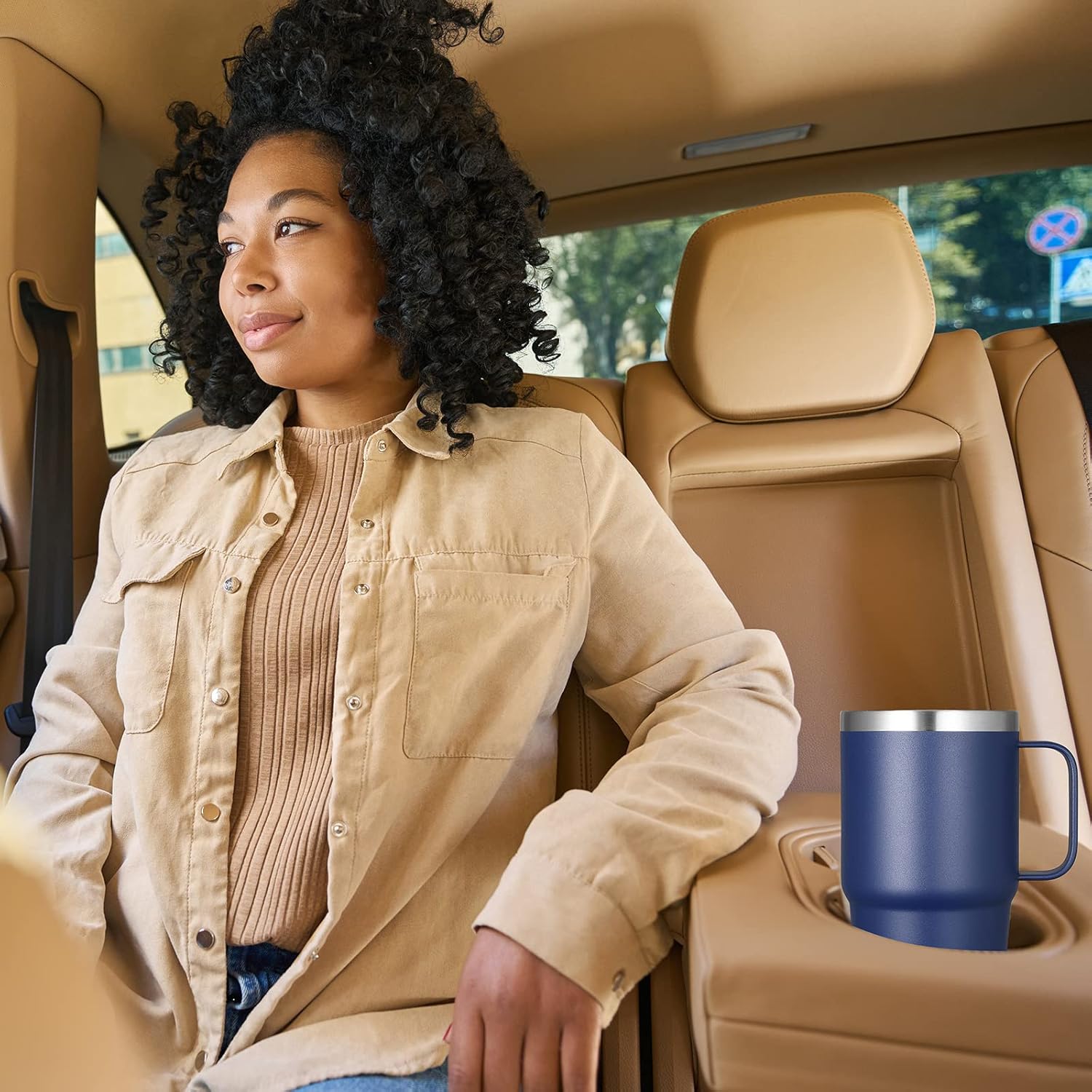 - Cupholder Friendly: The travel coffee tumbler 20oz is designed with a tapered shape which fits most car cup holders, equipped with a sturdy handle that allows easy carrying. Diameter 3.38" large cup mouth makes it easier for you to clean the stainless steel mug