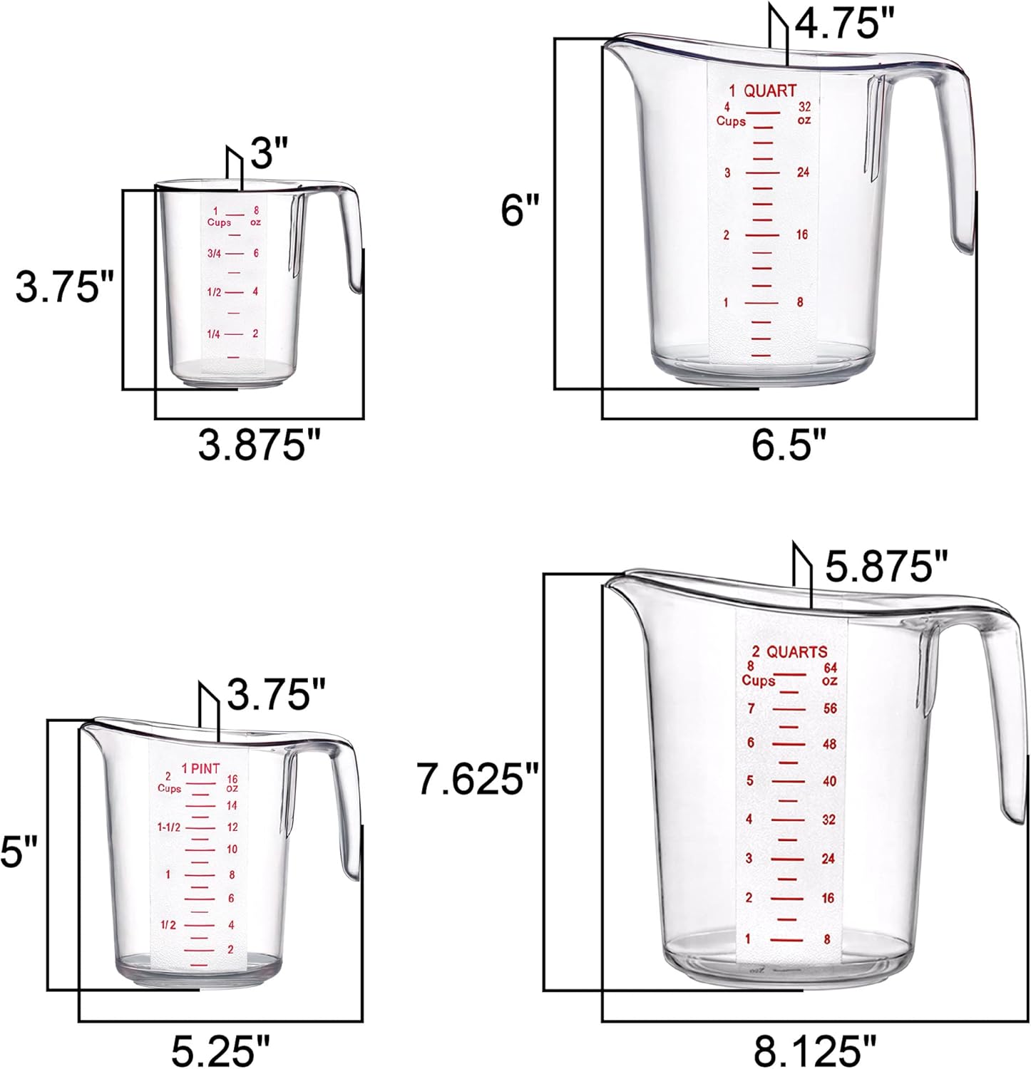 - [MULTIPLE SIZES] The package includes 4 measuring cups of various capacities: 1 cup (8 oz, 250 ml), 2 cups (16 oz, 500 ml), 4 cups (32 oz, 1000 ml), 8 cups (64 oz, 2000 ml)