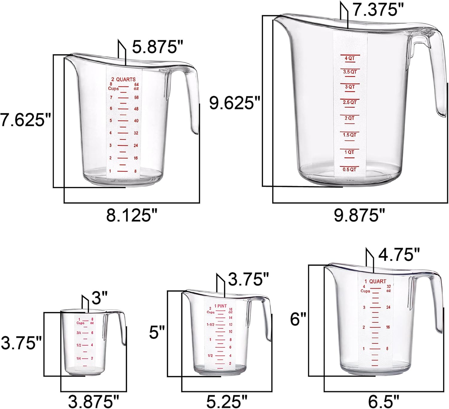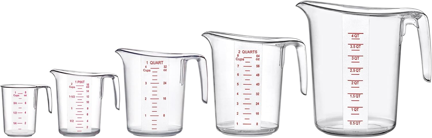 - [MULTIPLE SIZES] The package includes 5 measuring cups of various capacities: 1 cup (8 oz, 250 ml), 2 cups (16 oz, 500 ml), 4 cups (32 oz, 1000 ml), 8 cups (64 oz, 2000 ml), 16 cups (128 oz, 4000 ml)