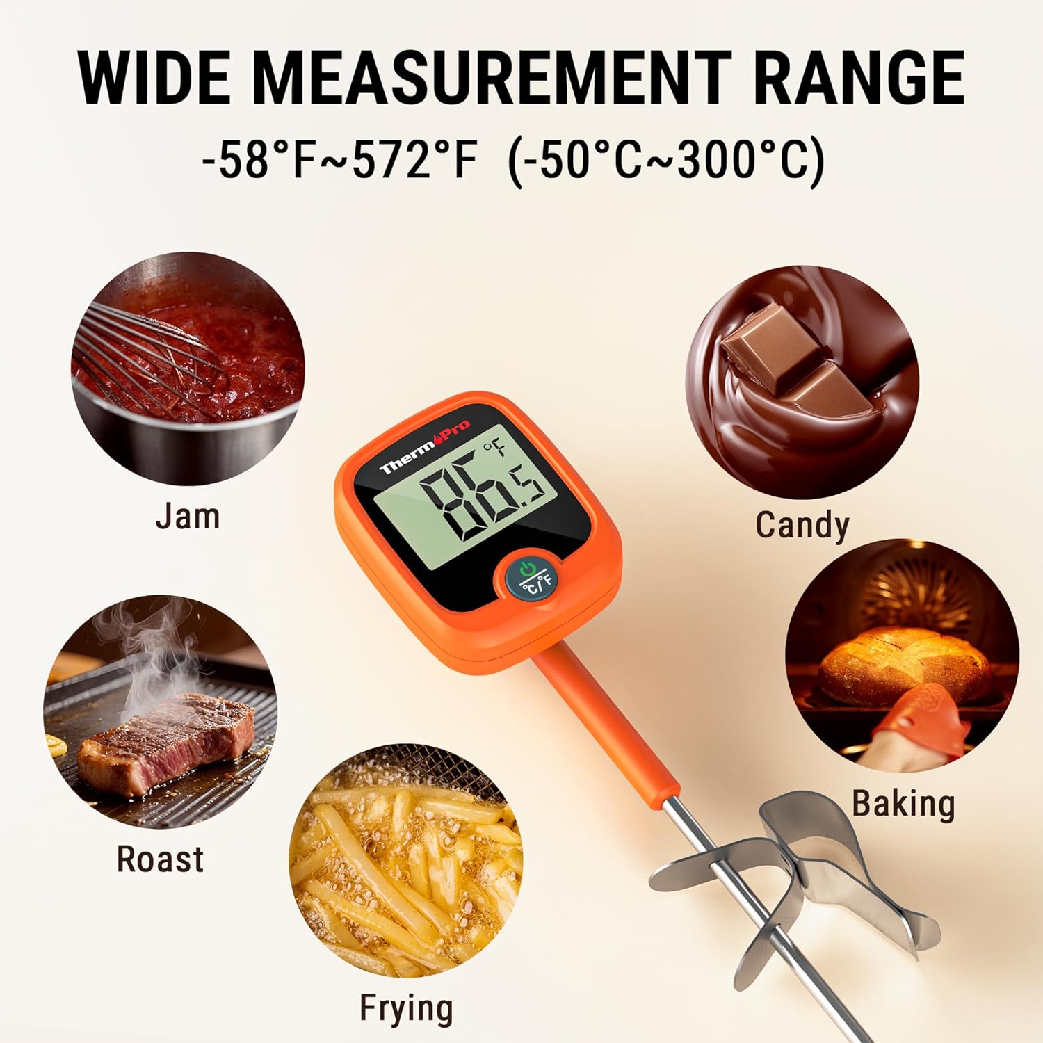 - ăWide UsagesăFood thermometer with wide temperature range from -58 to 572 degrees Fahrenheit, perfect for candy making accessories, frying oil, meat, maple syrup, grease, yogurt, cheese, brewing