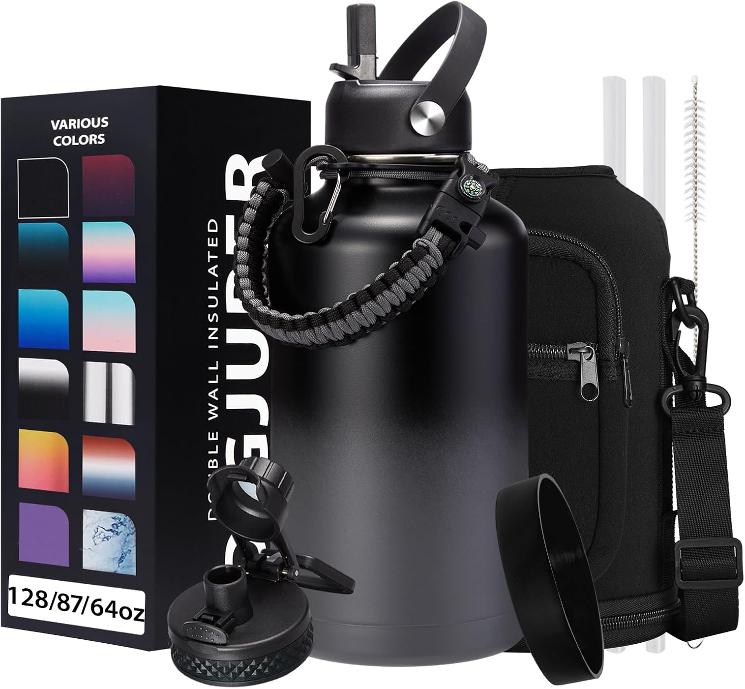 - SUPER JOYFUL COMBO: Buy a 64 oz insulated water bottle, get 9 accessories (2 x lids, 1 x survival paracord, 1 x carrying pouch, 1 x shoulder strap, 1 x protective cup mat, 2 x straws, 1 x straw brush). DIGJUPER provide a lifetime warranty and 7X24H customer service.