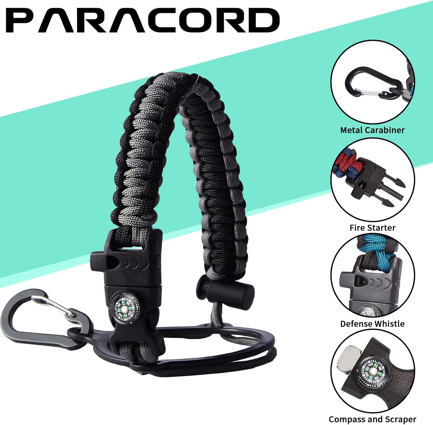 - UNIQUE DESIGNS PARACORD HANDLE: Full-function paracord handle made in individual styles to match the color of the flask water bottles. With compass, safety ring, carabiner, flint fire starter & whistle. It unravels into a sturdy and taut rope in an emergency, making the large water jug an ideal survival kit for expeditions in the wild