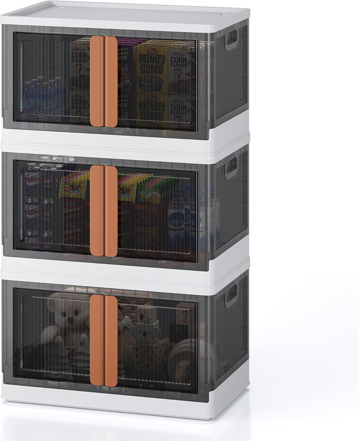 19Gal Collapsible Storage Bins with Lids & Wheels - 3 Pack Stackable with Doors, Heavy-Duty Plastic Containers for Home/Office, White