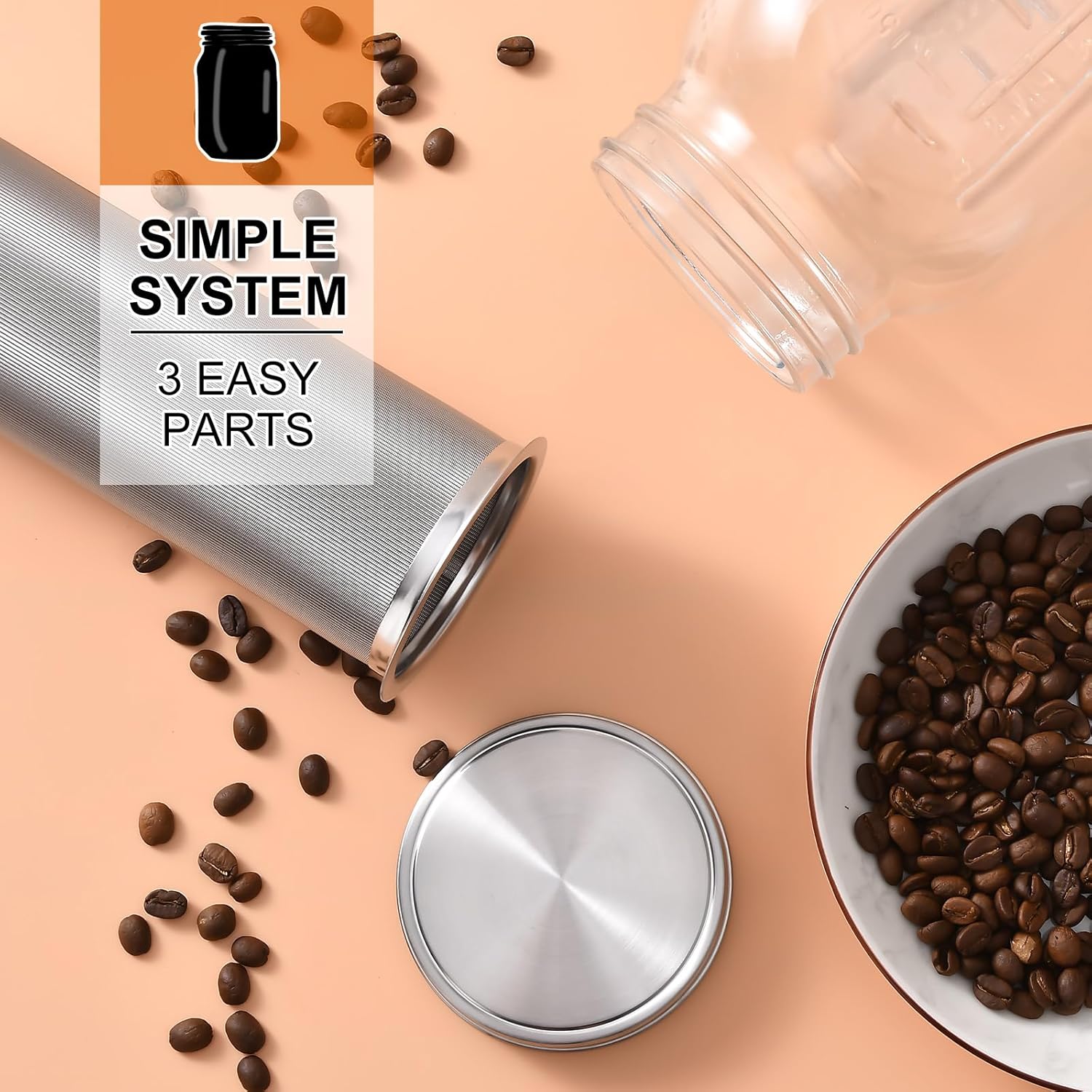 - STAINLESS STEEL FILTER: Constructed of high-quality mesh that prevents coffee grounds from entering the jar. The heavy-duty filter will provide years of iced coffee perfection.