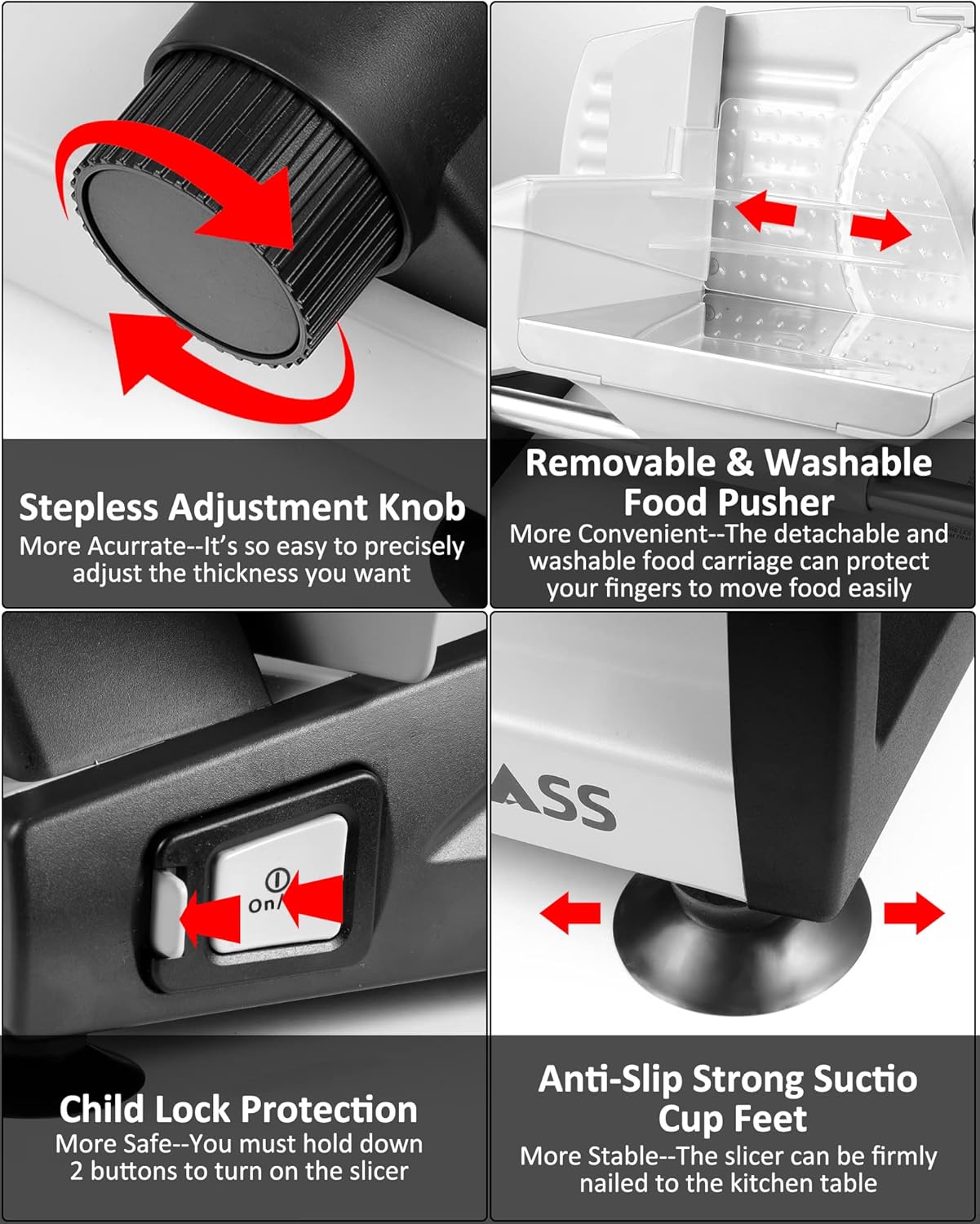 - [Precise Adjustable Thickness] -New design upgrade stepless adjustment knob for easy adjustment of slice thickness, from ultra-thin to about 3/4-inch thick, cuts a variety of foods such as meats, deli, cheese, roast beef, turkey breast, vegetables and fruits.