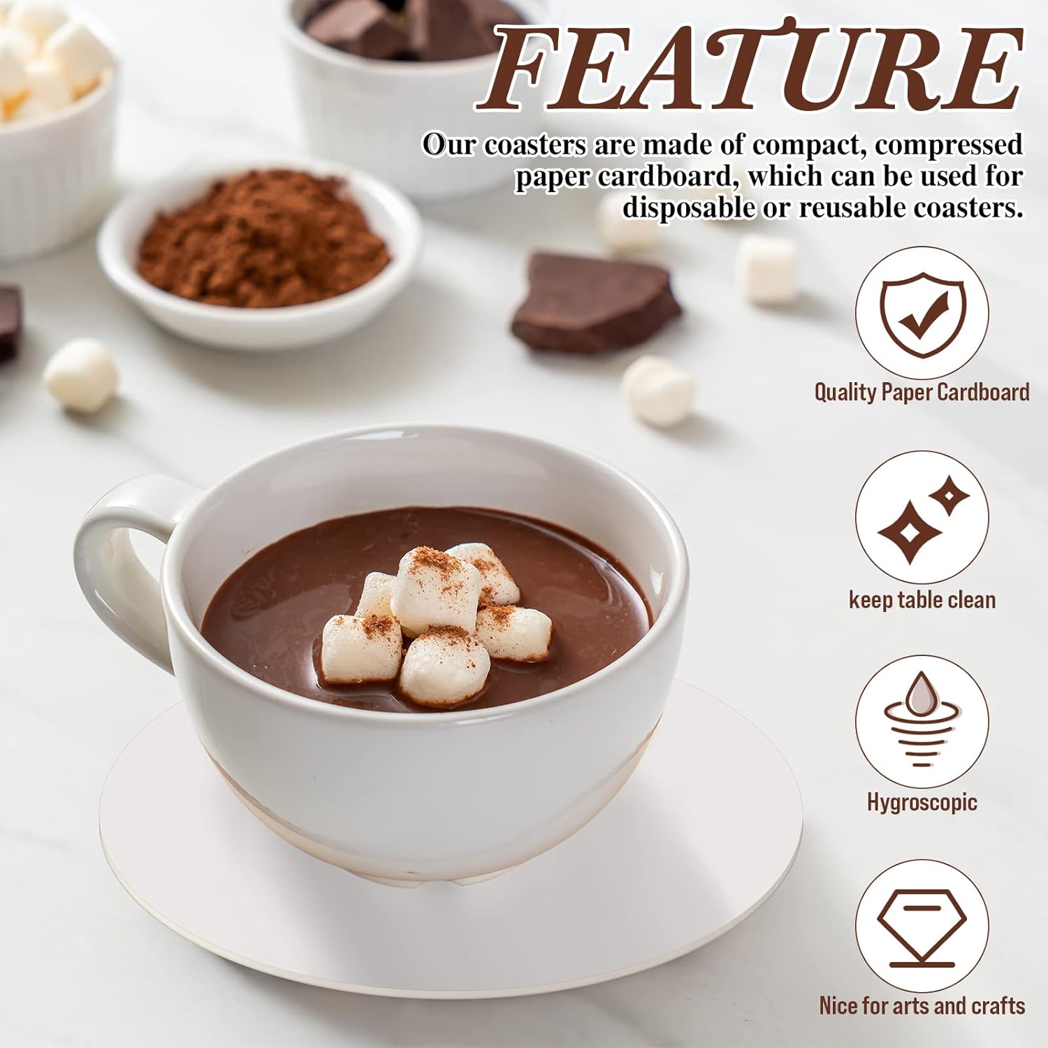 TaoBary 200 Pcs Disposable Paper Coasters Bulk 1MM, 4 Inch Round Cardboard Coasters Blank for Bar Drinks DIY Crafts Arts Wedding (White)