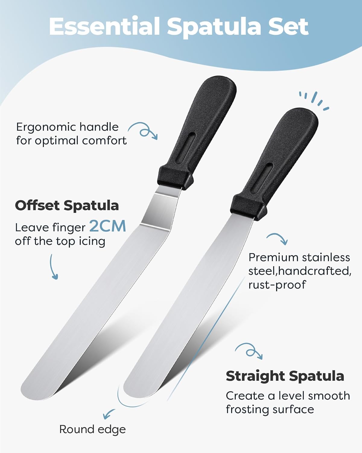 • Straight and Angled Frosting Spatulas: These high-quality stainless steel frosting spatulas make it easy to even out frosting and work on layered cakes. With a 12.5-inch angled spatula and a 10.6-inch straight spatula, you can create even crumb layers and perfect surfaces.