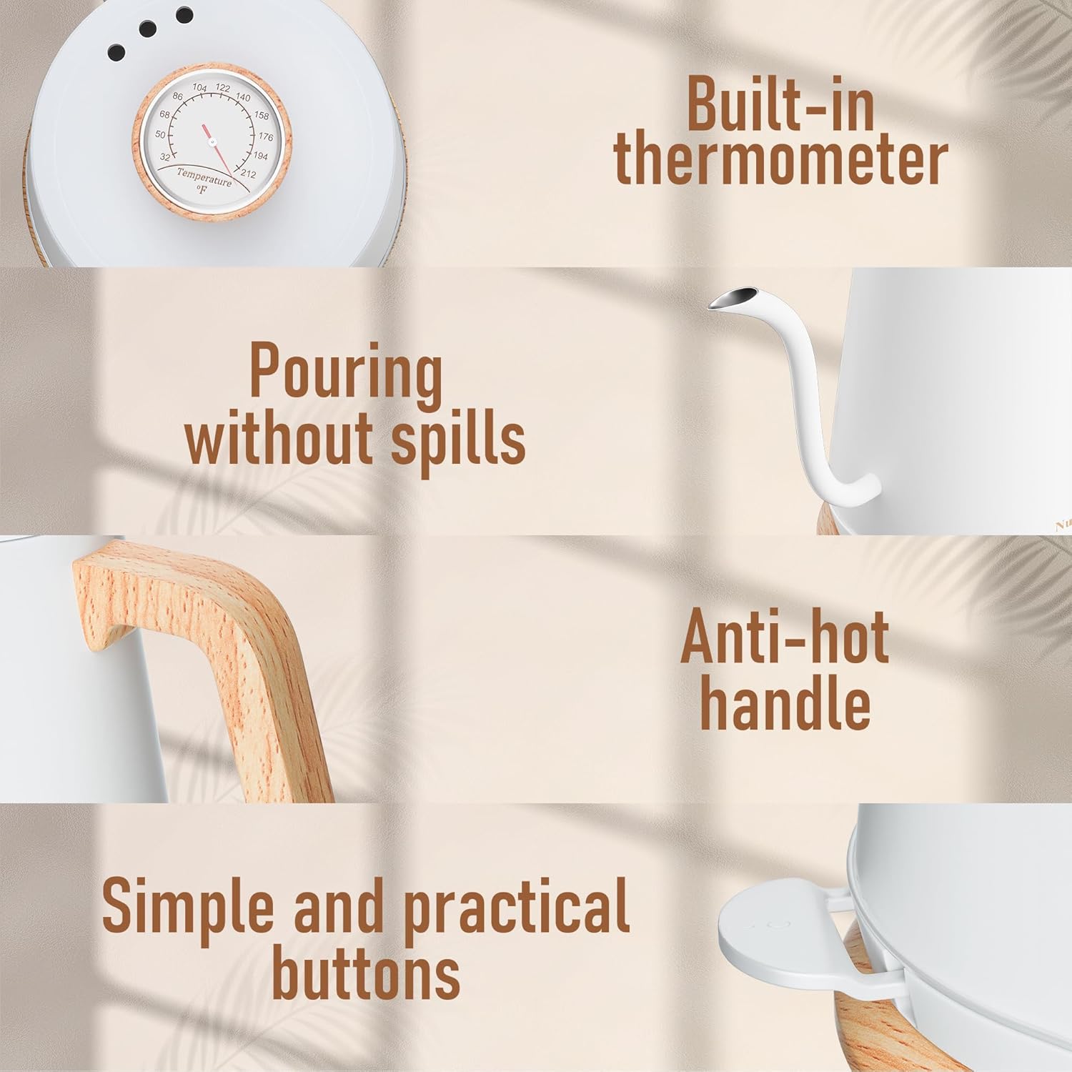 Nueve&Five Gooseneck Electric Kettle with Thermometer,Electric Tea Kettle 1L with Auto Shut-Off,1000W Hot Water Kettle of Stainless Steel for Coffee & Tea -White