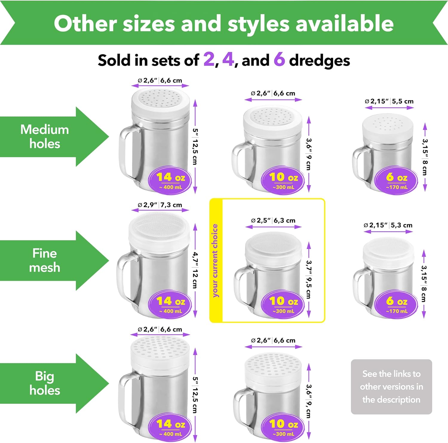 - You will receive two stainless steel dredges (10 oz) with handles, twist-off lids, and plastic caps; style: fine