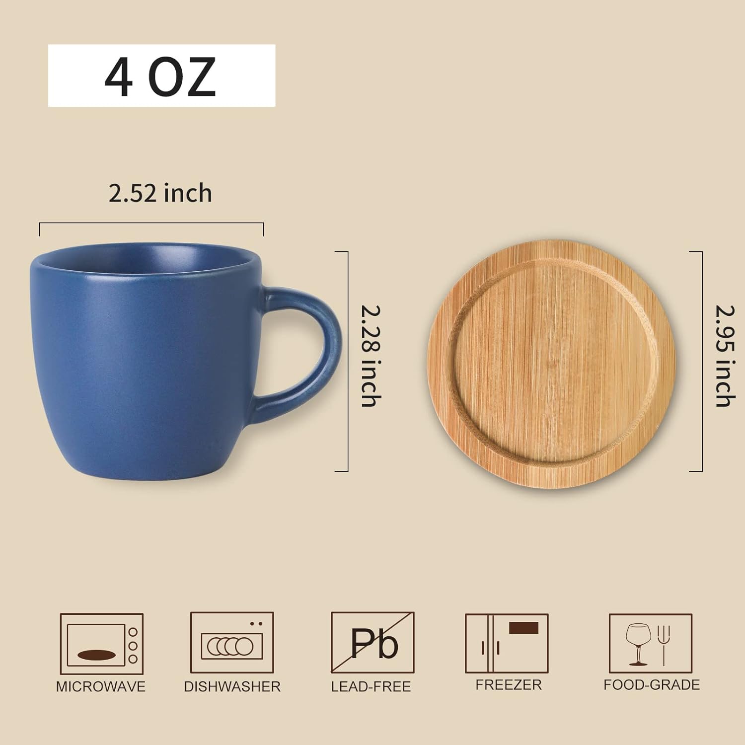 - IDEAL SIZE FOR COFFEE DRINKER: Each espresso cup measure 2.5 inch diameter and each bamboo saucer measures 2.9 inch diameter. The cappuccino cups can hold 4 oz and work well with the espresso machine. A nice espresso coffee cup can help you enjoy the smell and aroma of the coffee. Enjoy the afternoon tea time with your friends using these ceramic coffee cups.