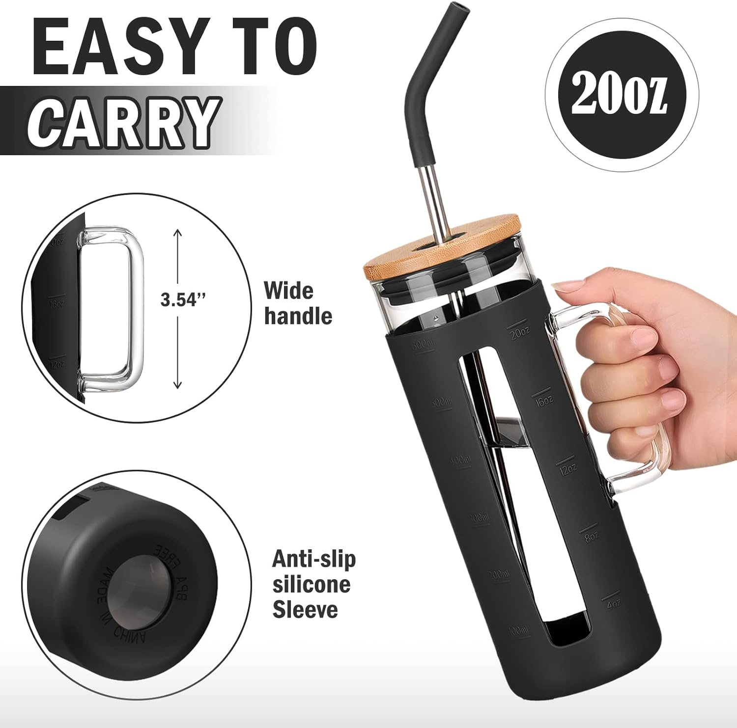 - URABLE BOROSILICATE GLASS- This 20 oz tumbler with handle is made of borosilicate glass, which is stronger and more durable than other glass. Suitable for temperatures from -4℉ to 300 ℉. All materials are guaranteed food grade, BPA-free, odor-free and pollution-free.
