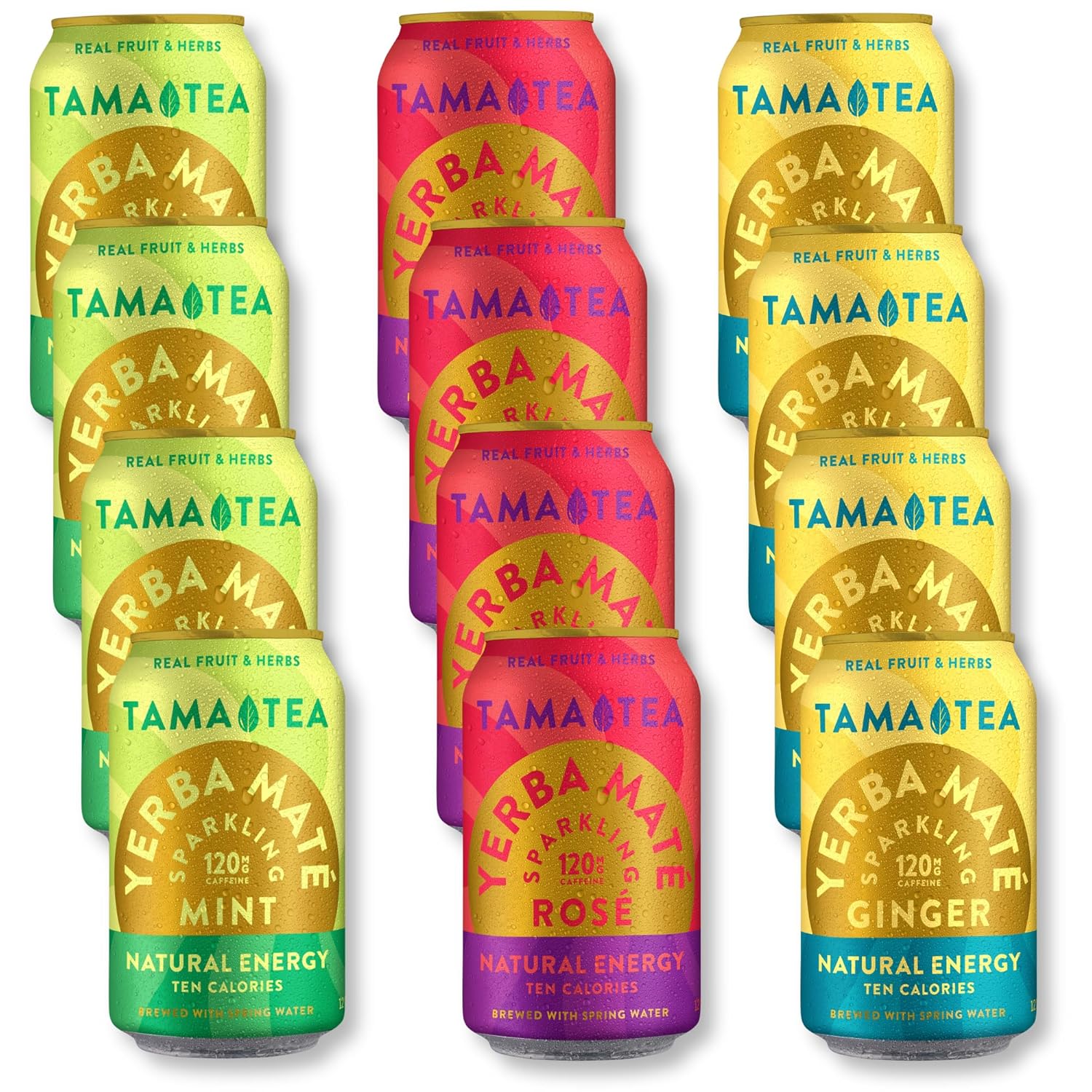 Sparkling Yerba Mate Variety Pack by Tama Tea - Unsweetened Natural Energy Drink with Real Fruit & Herbs - Healthy Caffeine Drink Alternative - 120mg of Caffeine, 10 Calories - 12oz Pack of 12