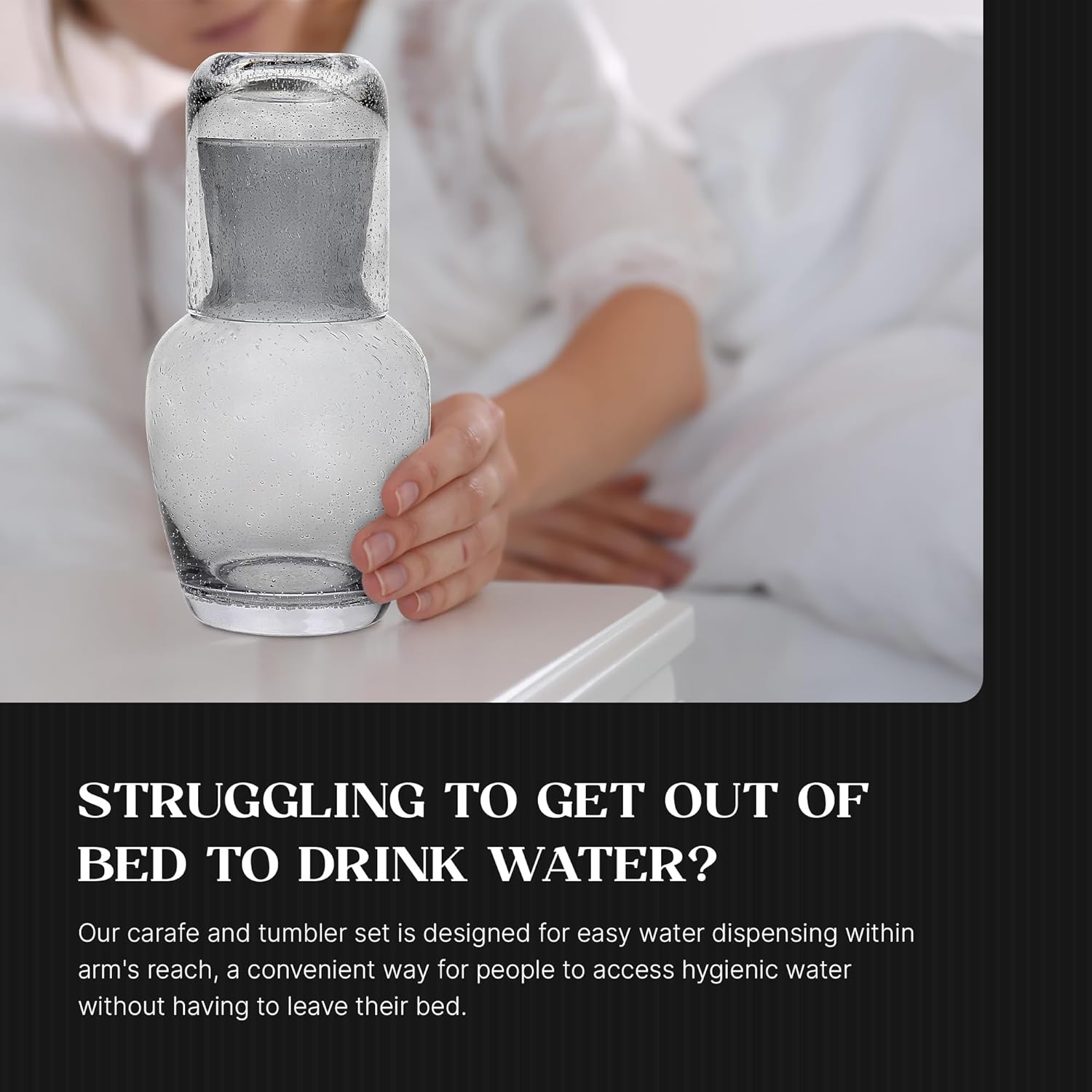 - Perfectly Sized: Measuring 4.13 x 8.15 inches this bedside carafe with black lid has a capacity of 28.06 ounces. Sufficiently sized to hold any drink, use it to store bedside drinks of water, herbal iced tea for lunch or refreshing orange juice in the morning for breakfast.