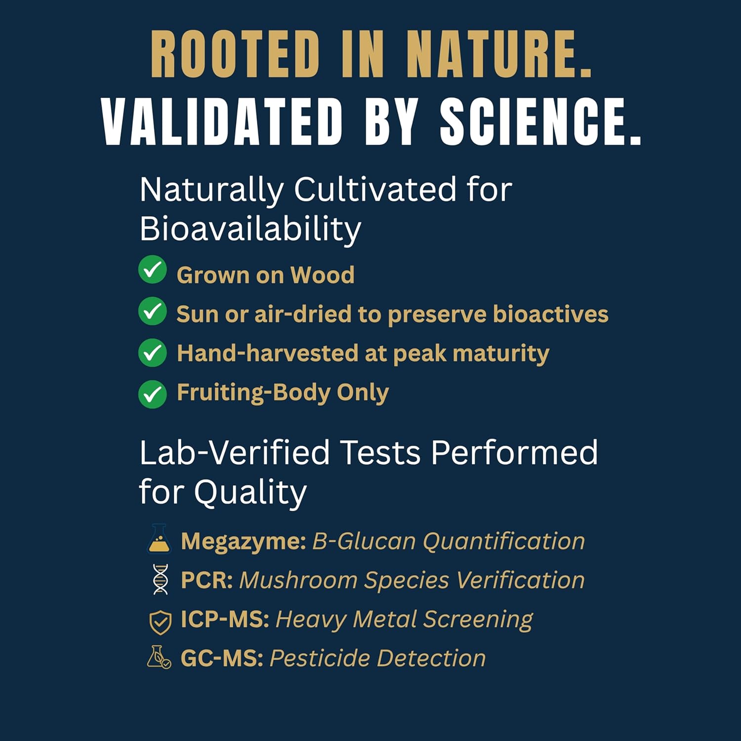 - 1,200 mg ADAPTOGENIC BLEND – 100% FRUITING-BODY MUSHROOMS - Crafted with USDA organic Lions Mane, Cordyceps, Turkey Tail, and Maitake—wood-grown and fruiting body only—for high beta-glucan (healthy nutrients) content. This nootropic blend supports focus, clean energy, immune function, digestion, and clarity without grain fillers or mycelium.