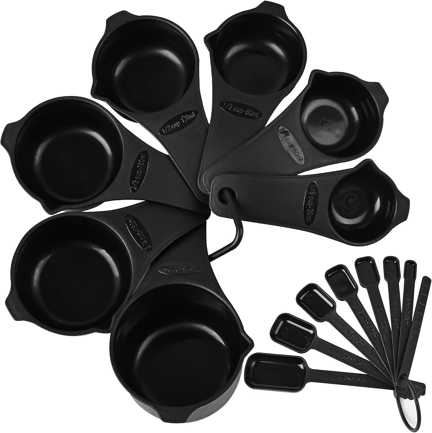 Measuring Cups and Spoons Set 15, 7 Plastic Measuring Cup Spoon Set, 7 Spice Long Handle Measuring Spoons with 1 Leveler for Kitchen and Baking, Dry Metric Measure Cups & Spoons Black