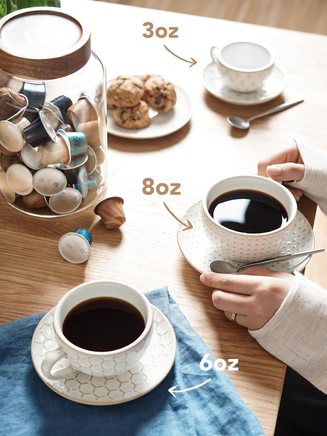 LE TAUCI Espresso Cups with Saucers 3 oz, Ceramic Embossment Coffee Cup for Double shot, Lungo, Ristretto,Dishwasher Safe - Set of 4, Arctic white