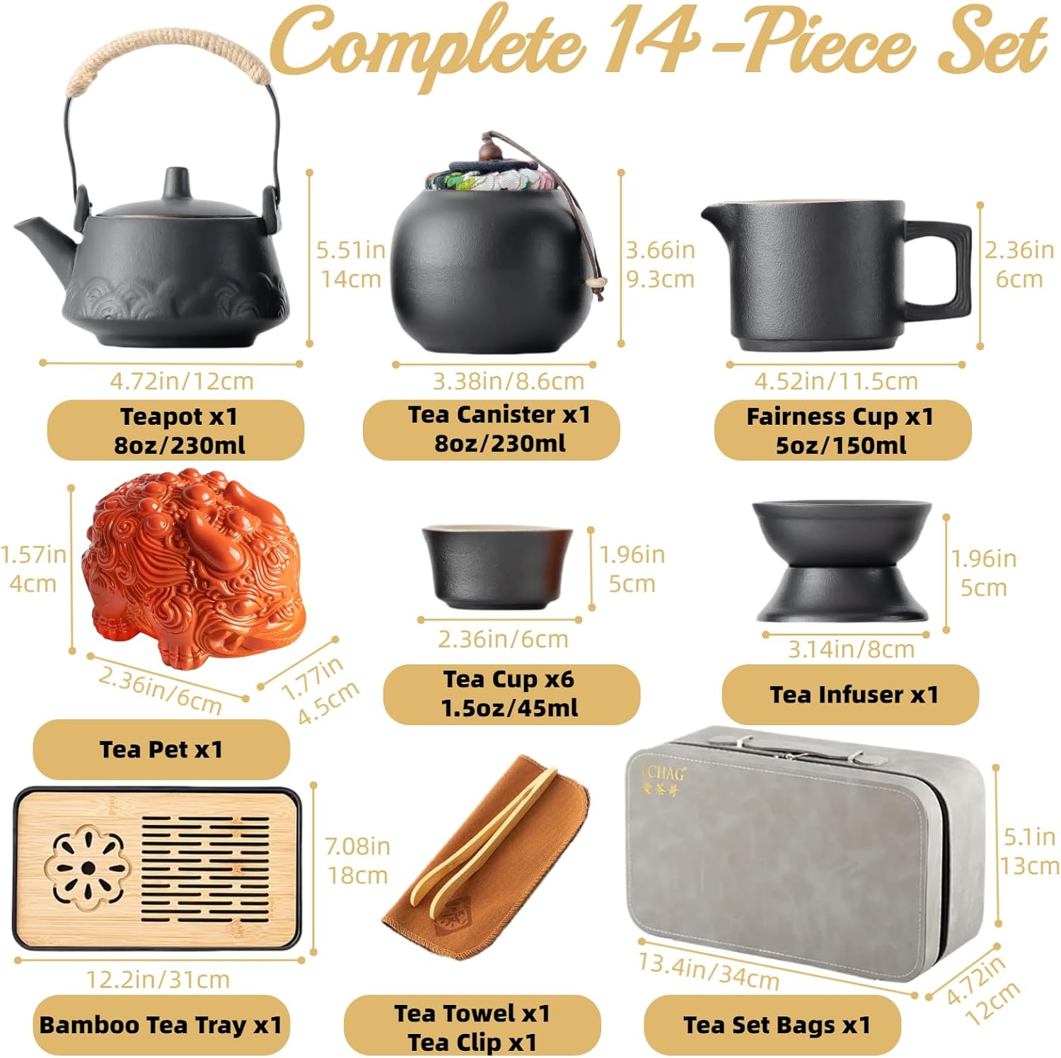 - 【15-Piece Chinese Tea Set 】This ceramic tea set combines traditional tea cups with a tea pot sets and color-changing tea pet. It includes 6 tea cup (1.5oz/45ml), tea pots (8oz/230ml), tea canister (8oz/230ml), fair/Infuser pot (5oz/150ml), pixiu tea pet, tea strainer, tea clip, tea towel, tea tray and travel bag