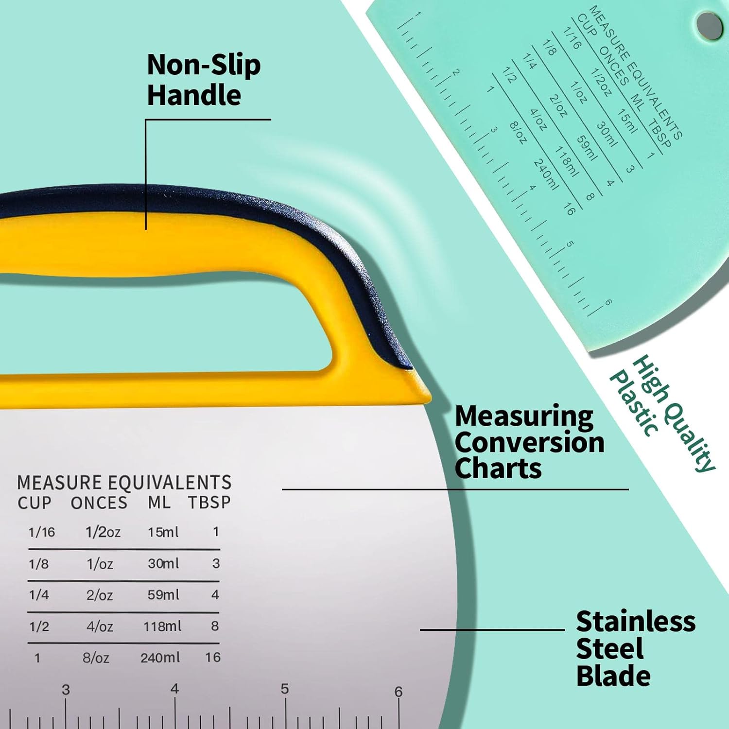 - CONVENIENT MEASUREMENT Both bench scrapers are engraved with easy-to-read measurement scales and conversion charts. The ruler lines on the bottom edge that measures up to 6 inches, makes it easy to cut pastry in the same size. The conversion chart will save you time looking conversions up in cookbooks or online (cup=fl oz=tbsp=ml).