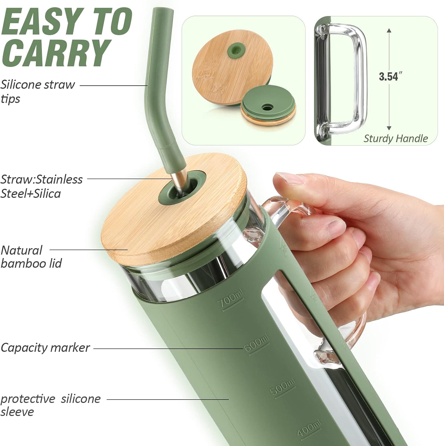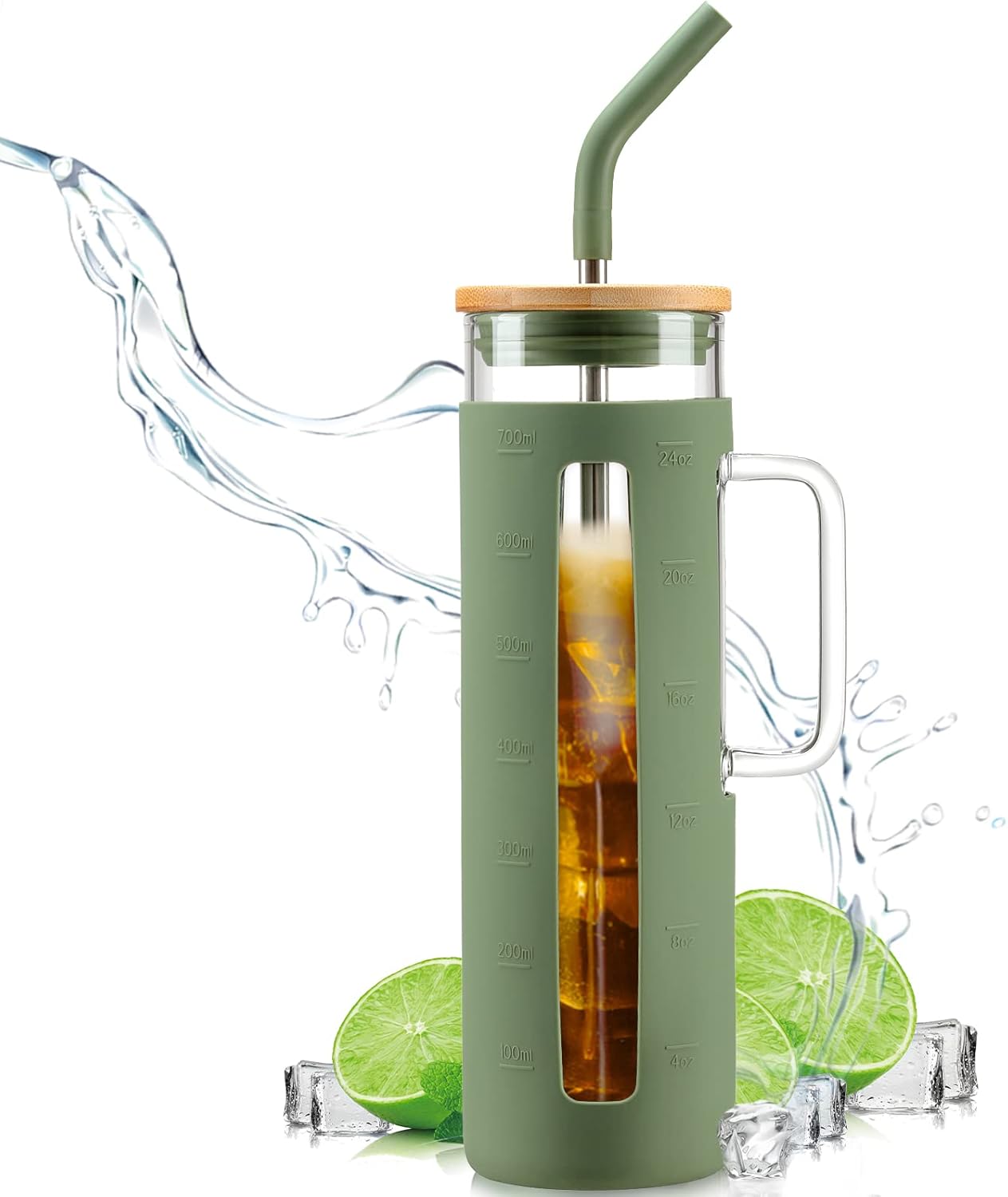 Kodrine Glass Tumbler with Handle, 24 oz Iced Coffee Cup Boba Smoothie Cup, Bamboo Lid Home Office Tumblers, Olive