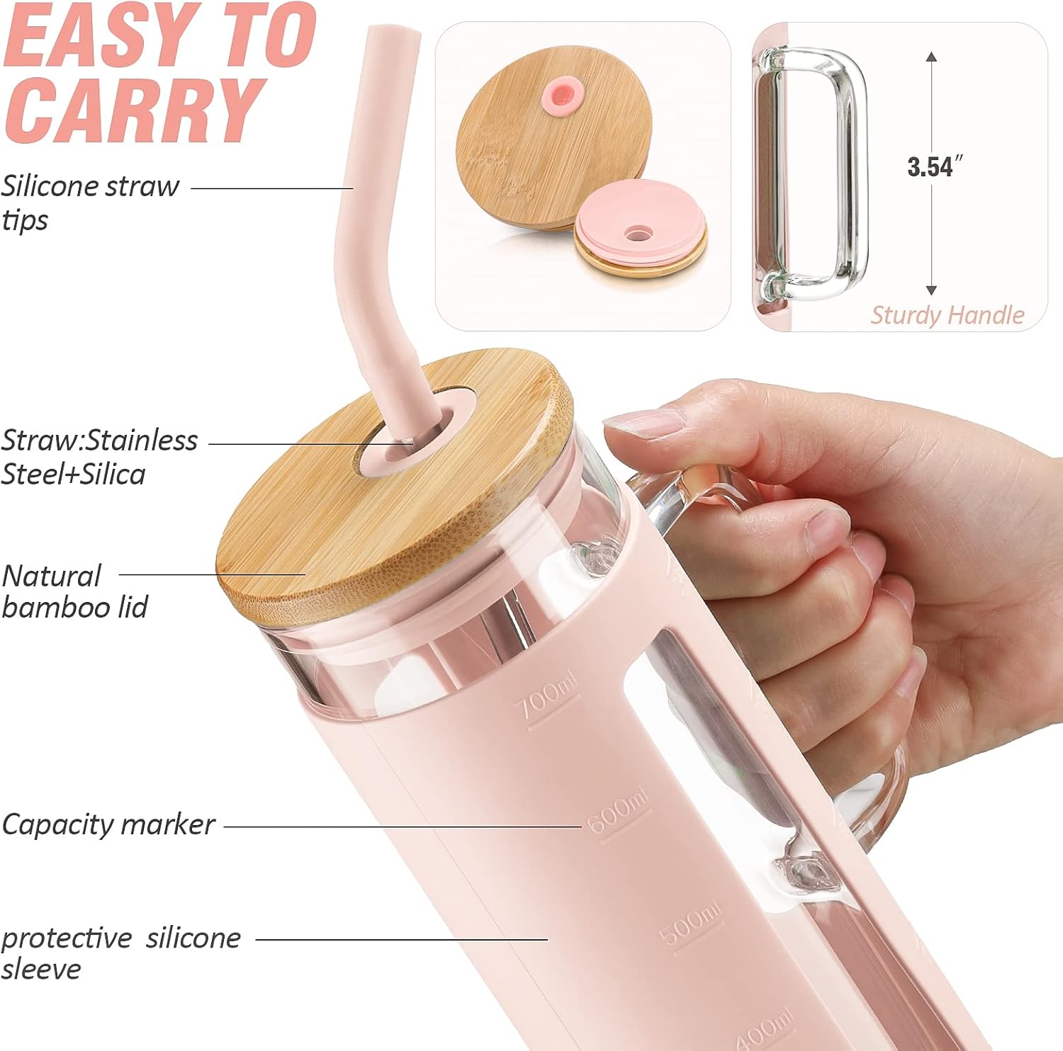 - GLASS TUMBLER WITH HANDLE - We specially customized the ergonomic thickened handle to make it easier to carry, you can take your beverage with you wherever you go. This portable iced coffee cup will become the indispensable companion to bring with you anywhere. And the glass tumbler with straw and lid will provide you a more healthy life.