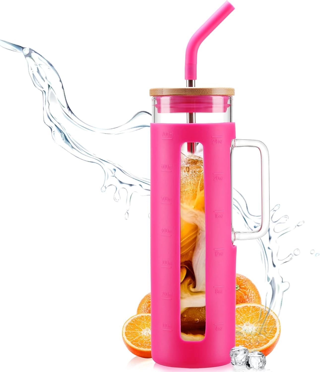 Kodrine 24 oz Glass Tumbler with Handle, Iced Coffee Cup Boba Smoothie Cup, Bamboo Lid Home Office Tumbler, Rose Red