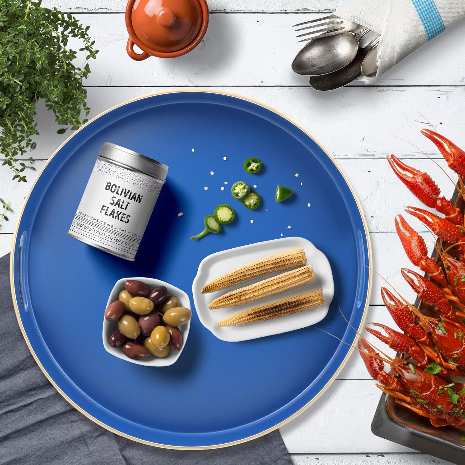 Royal Blue Round Decorative Tray with Handles, 13" Versatile Serving Tray for Coffee Table, Ottoman, Ideal for Serving, Displaying, Organizing