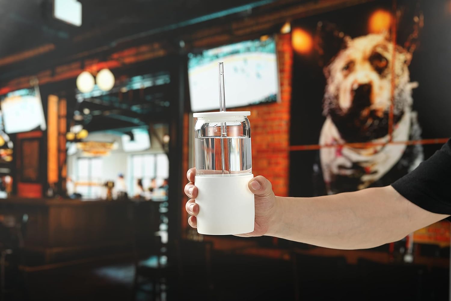 - Change the style of glass cups as you wish, you can match the colors of the cup lid and sleeve, such as a pink sleeve with a white lid. This reusable jar-shaped glass cup is perfect for iced coffee, iced tea, juices, sodas, milkshakes, jams, cocktails, beer, smoothies, bubble teas, and more.