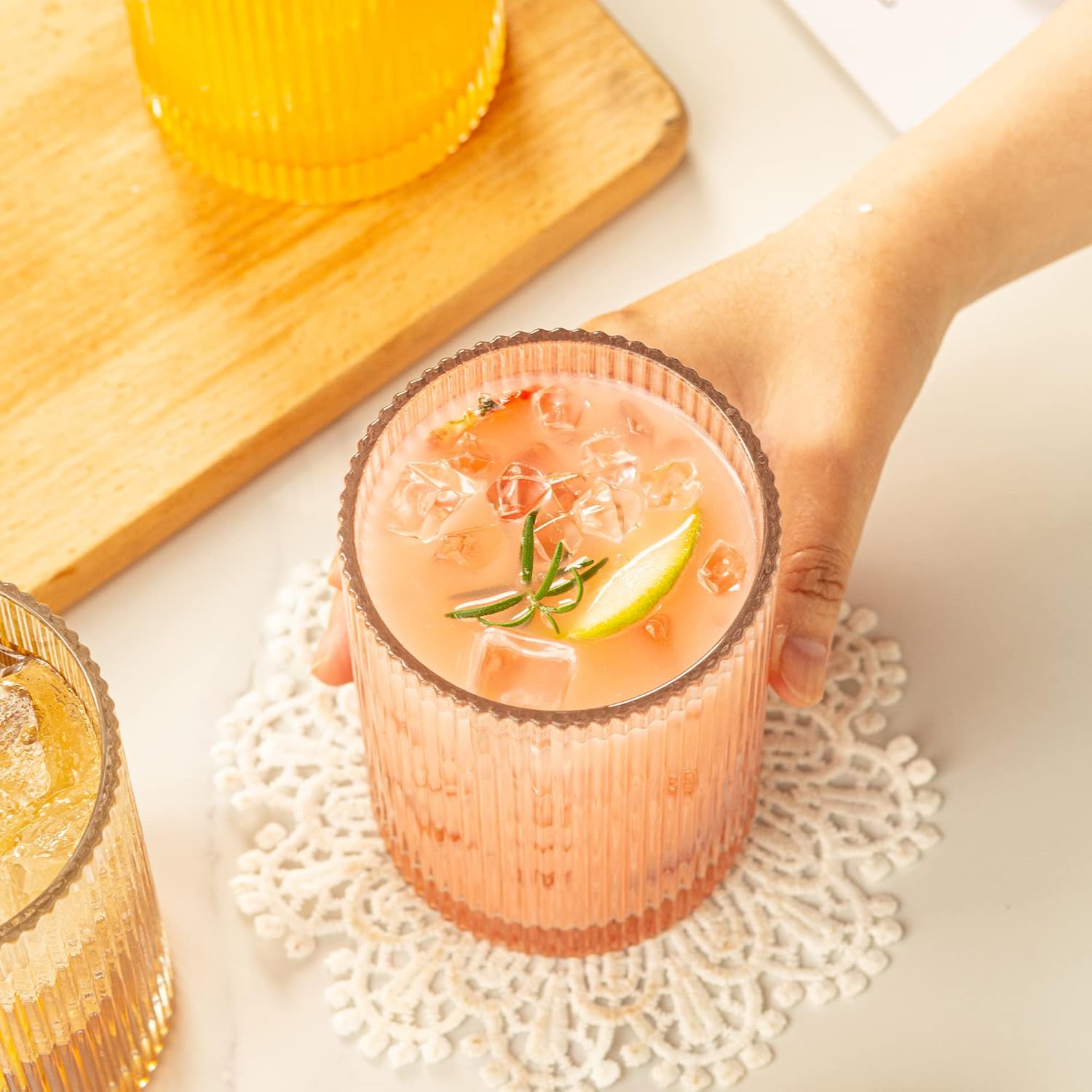 - 【VERSATILE USE】: Our glassware set is suitable for a variety of beverages, perfect for serving iced coffee, beer, smoothies, whiskey, margaritas, tea, boba, and fruit juice. The elegant ribbed texture adds sophistication and flair to any occasion, making these glasses a must-have addition to your home or party