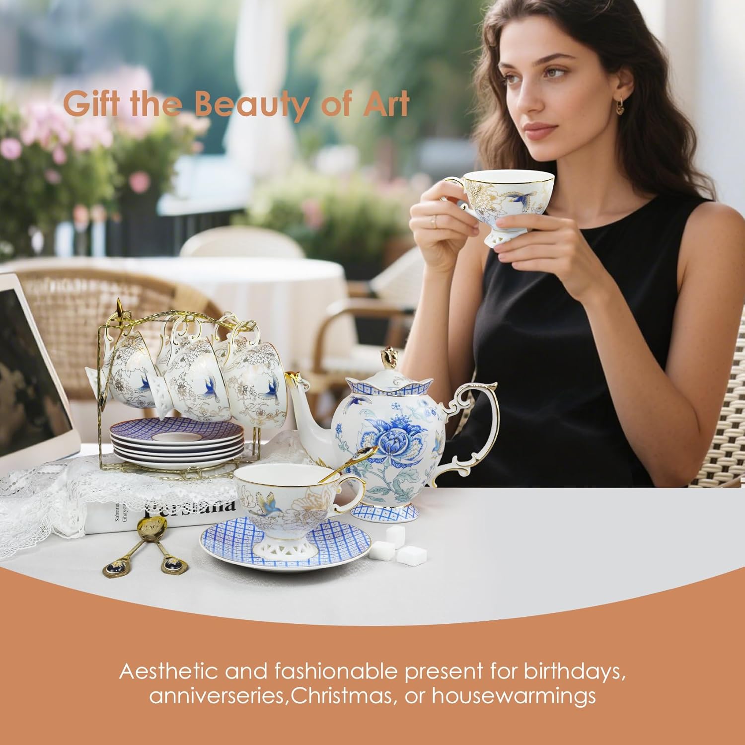 - Refinement and elegance: Our English tea set is a representative of elegance, delicate blue flowers with elegant gold tracery makes people attracted by its beauty at a glance, if your friends come to your home to visit you will be surprised by the appearance of this tea set!