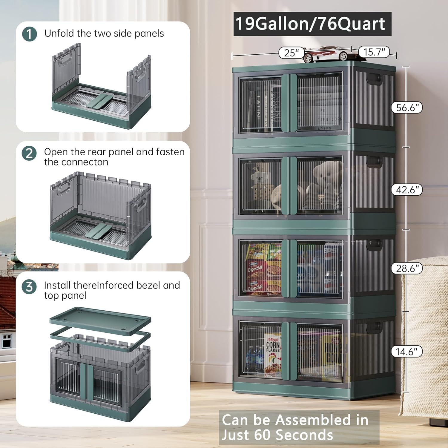 19Gal Collapsible Storage Bins with Lids & Wheels - 2 Pack Stackable with Doors, Heavy-Duty Plastic Containers for Home/Office, Green