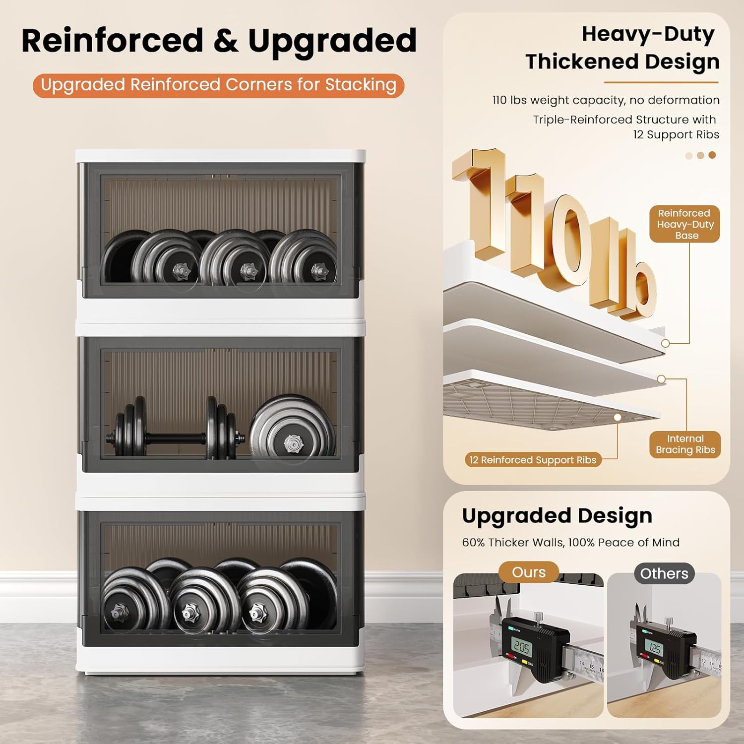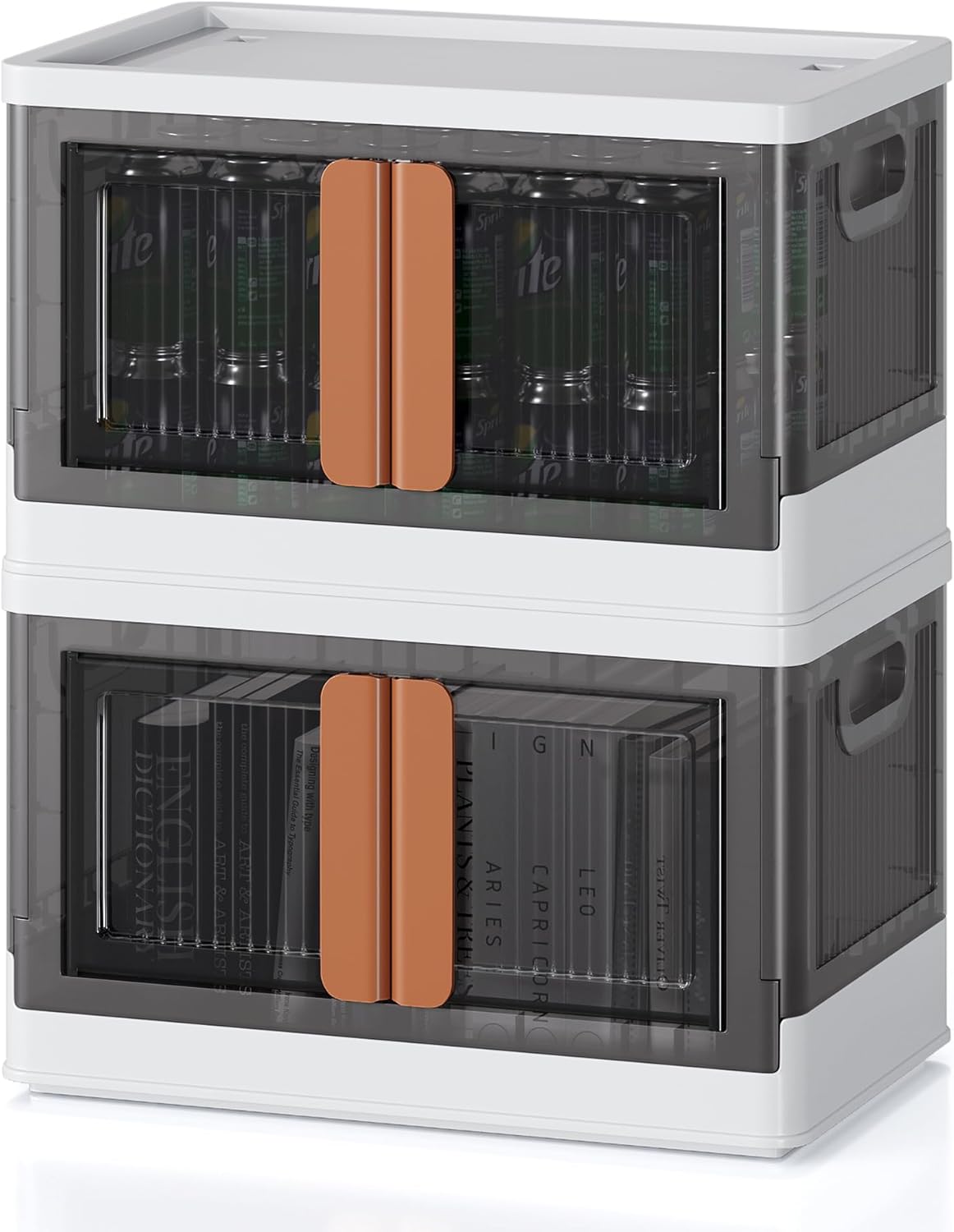 8.4Gal Collapsible Storage Bins with Lids & Wheels - 2 Pack Stackable with Doors, Heavy-Duty Plastic Containers for Home/Office, White