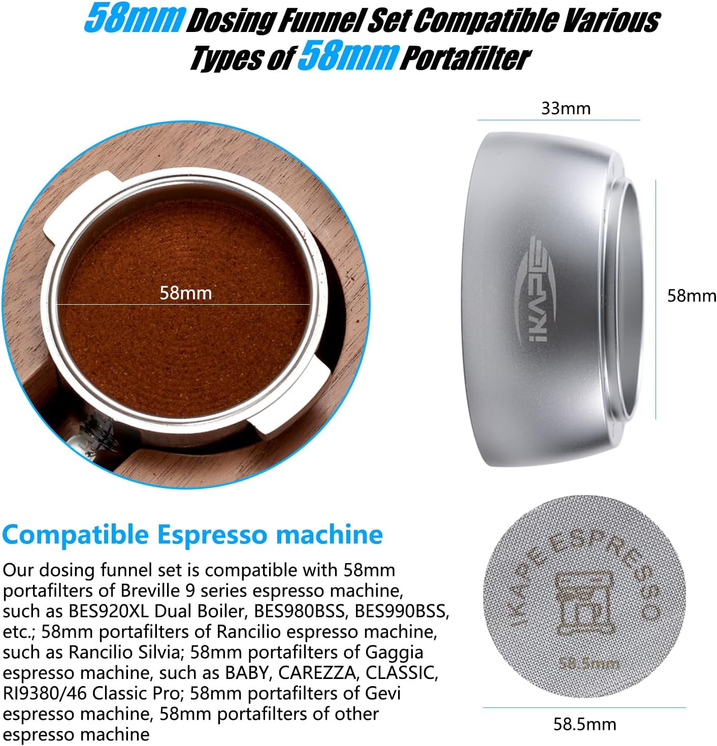 - Applicable Range - IKAPE espresso dosing funnel is designed specifically for working, and the inner diameter of the espresso Dosing ring is 58mm, which is compatible with most of the 58mm portafilters on the market, including Rancilio, Gaggia, E61, Flair 58, ECM, Rocket, Sanremo, Synesso, Slayer Bottomless Portafilter