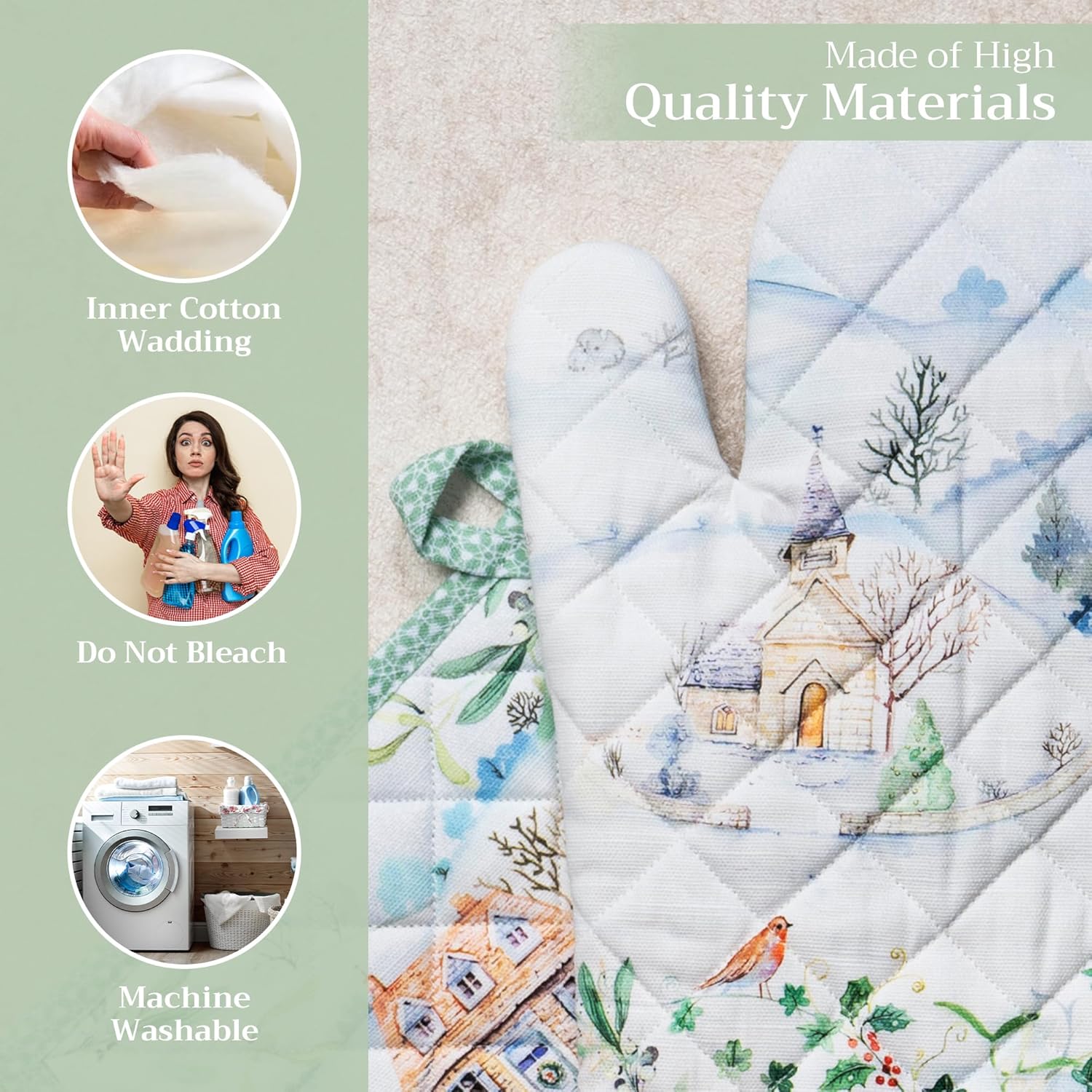 - Artistic style: Add charm to your kitchen with our oven mitt pot holder set featuring watercolor designs inspired by traditional European motifs. Stylish and functional kitchen accessories for every home cook or gift occasion.
