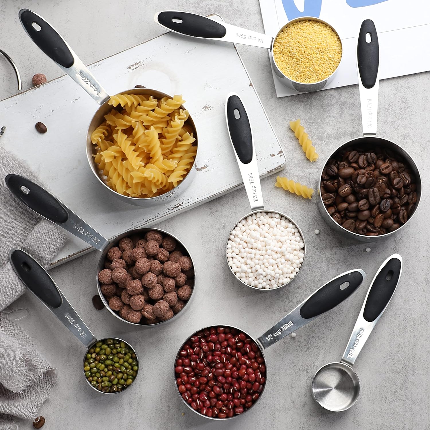- Measuring cups set of 8 :1/16cup,1/8 cup, 1/4 cup, 1/3 cup, 1/2 cup, 2/3cup, 3/4cup,1 cup , 1 cup, meet all your needs,the stainless steel rings hold them together.