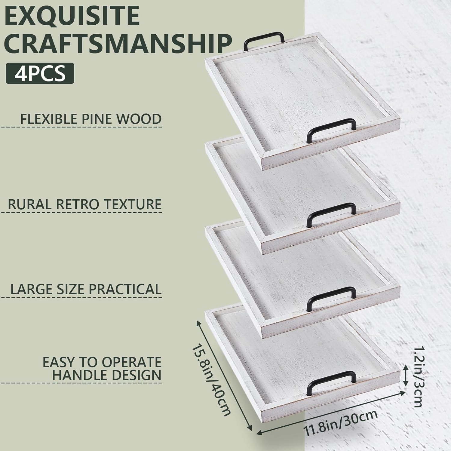 Lallisa 4 Pcs Large Wooden Serving Tray Decorative 15.8 x 11.8 x 1.2 Inch Ottomantray Rustic with Handles Coffee Table Decor Wood Tray Kitchen Platter for Party Tables Breakfast Wedding (White)