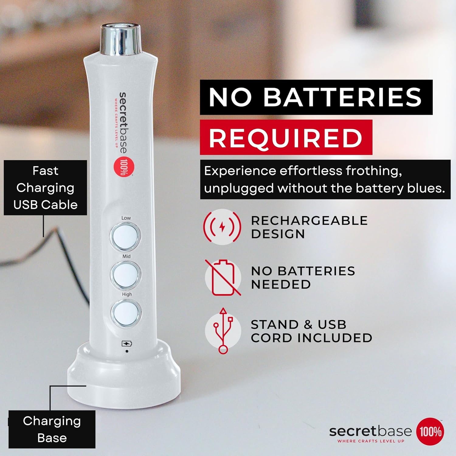 - Rechargeable For Reliable Power: Letās face it. Battery-operated frother chew through batteries like snacks. Secretbase rechargeable wand eliminates the hassle and cost of constantly replacing batteries. Plug it into a wall charger, or computer, and youāve got lattes at your fingertips.