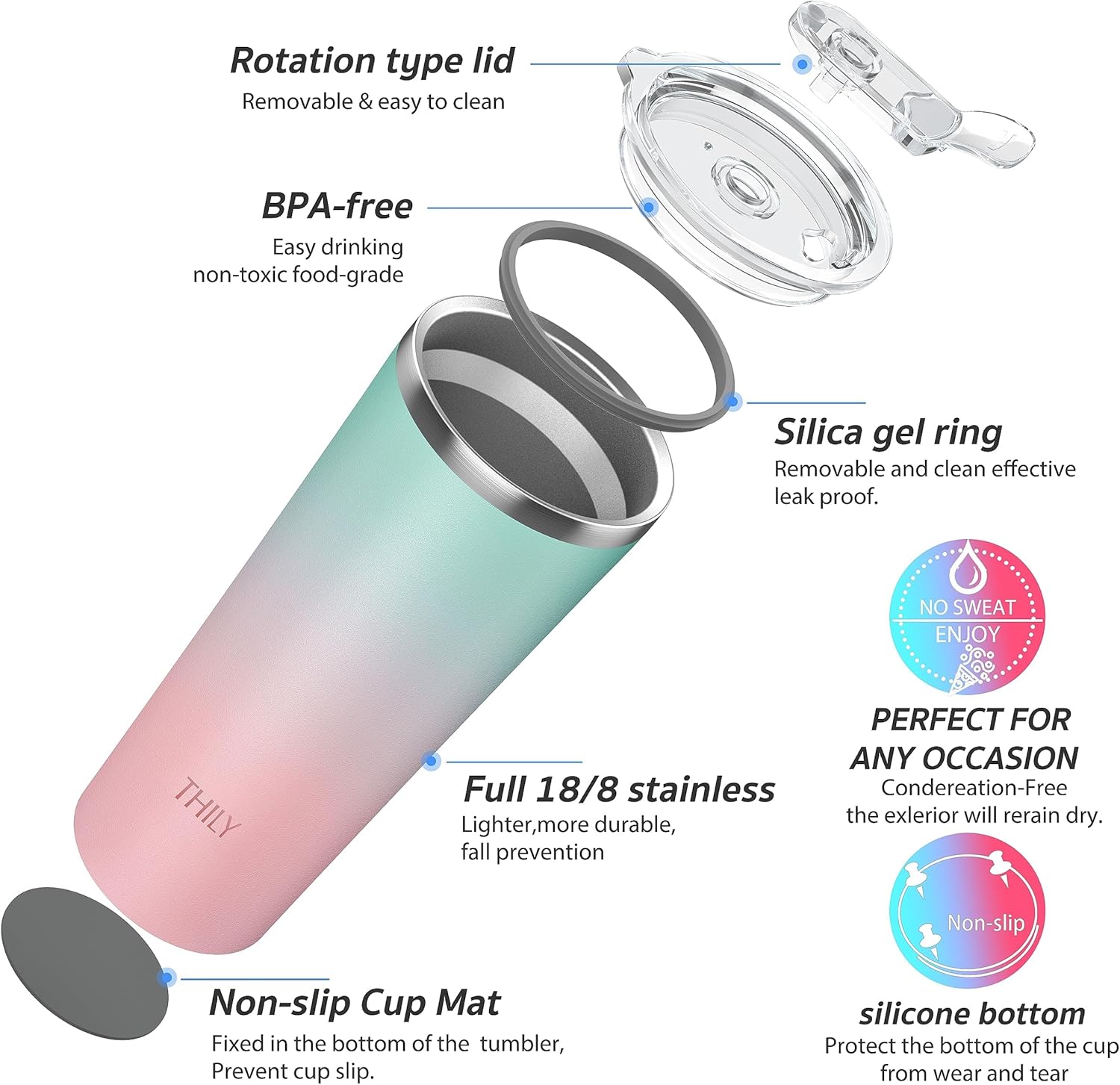 - PREMIUM FOOD GRADE STAINLESS STEEL - THILY insulated tumbler is crafted from 304 food-grade 18/8 stainless steel, durable and shatterproof. Highly resistant to rust and to absorbing odor, taste. All components are non-toxic, BPA free and environmentally friendly, won’t alter flavors or leach chemicals. Help save the ecosystem by using a washable and reusable alternative to your daily beverage intake.
