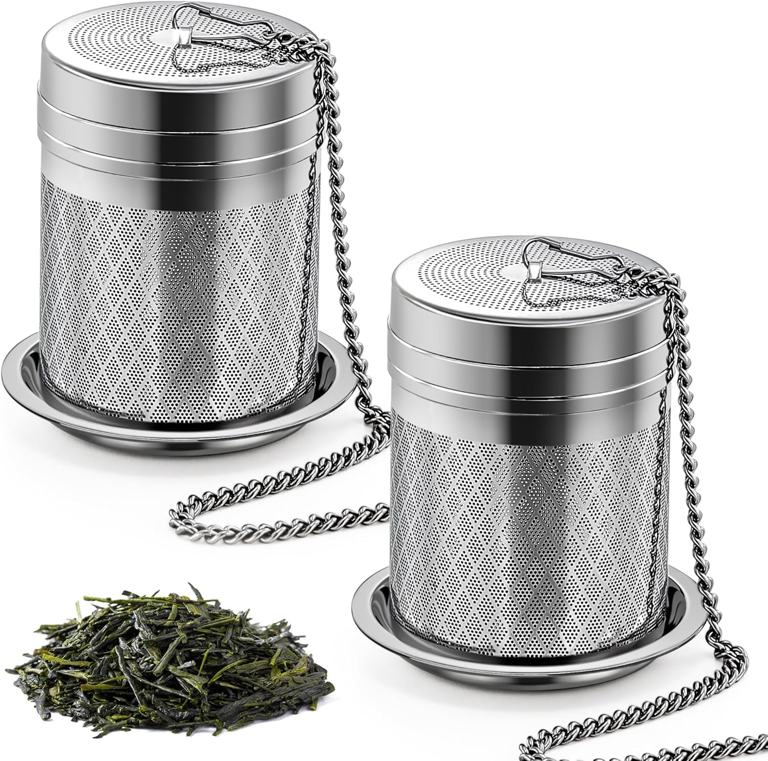 Tea Infusers for Loose Tea, 2 Pack Extra Fine Mesh Tea Strainers, 18/8 Stainless Steel Loose Leaf Tea Steeper Tea Diffusers with Extended Chain Hook and Drip Tray